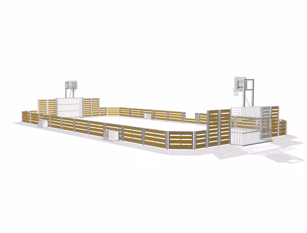 Standardmåttet är 10 × 18 meter, men arenan kan anpassas efter behov och platsens förutsättningar. I kortsidorna finns fasta, integrerade fotbollsmål, och ovanför varje mål sitter ett basketstativ med vit platta, vilket gör att planen enkelt kan användas för flera olika bollsporter. Konstruktionen är genomtänkt för att vara både stabil och lätt att montera, och hela arenan förankras säkert i betong.