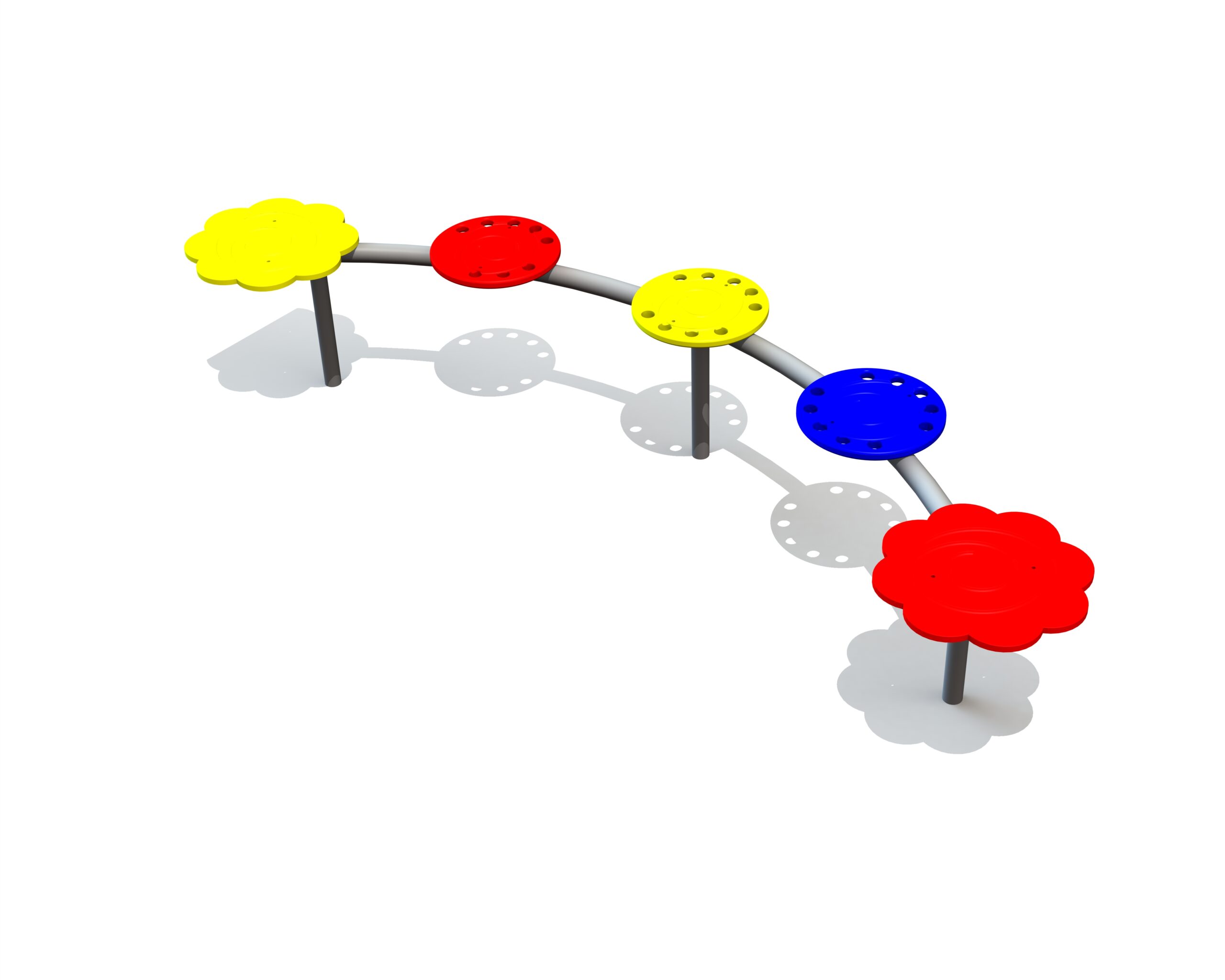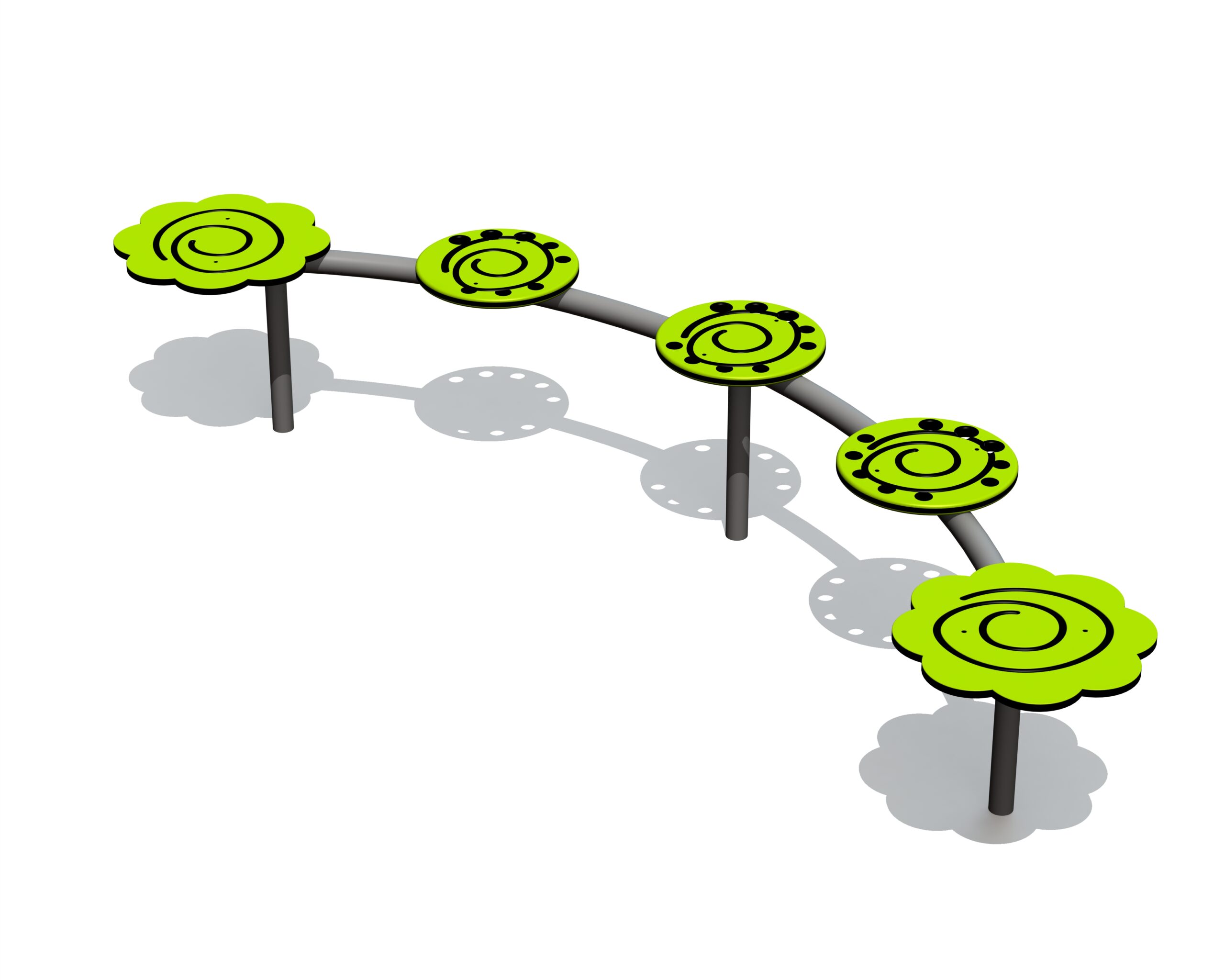Spiralbalken med färgade ark hjälper till att träna balans och koordination. Tallrikarna kan även användas som sittplatser och de har ett antal olika hål som hjälper barn att lära sig siffror.