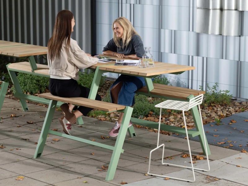 Bänkbord Holmi Bar 4-sits i trä och pulverlackerat stål för sociala mötesplatser utomhus.