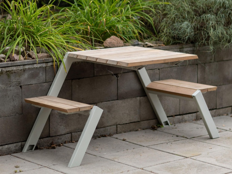Bänkbord 2-sits i massivt trä och pulverlackerat stål, fristående eller för förankring.