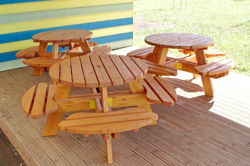 Klassiskt bänkbord i väderbeständigt limträ för picknick, raster och utomhusstudier.