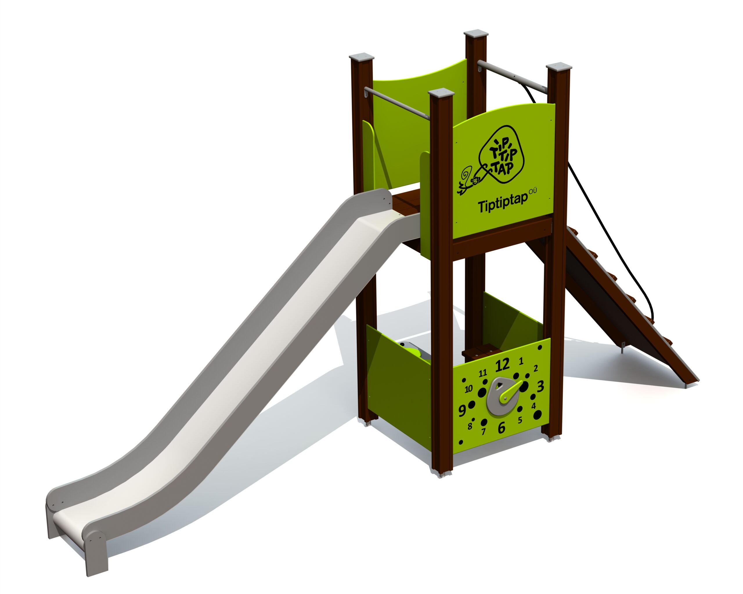 En rutschkana med rutschkana och ramp. Rampen har både med stegpinnar. Det finns en rolig lekhörna med en bänk under plattformen, som kan förses med antingen köks- eller bilinstrumentpanelselement. Utsidan är försedd med en klocka aktivitetspanel som hjälper till att lära sig att säga tid. Lekcentrets sidopaneler kan växlas till olika aktivitetsväggar eller tematiska tryckta paneler (djur, fåglar, fiskar, träd, bär, etc.). Utformningen av panelerna kommer att slutföras med kunden vid beställning.