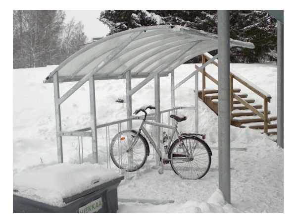 Cykelgarage Haga 5 är ett cykelskydd med lutande tak, avsett för förvaring av upp till 5 cyklar samtidigt och lämpligt för placering i offentliga miljöer. Garaget är öppet från ena sidan för smidig in- och utparkering. Stommen är en stålkonstruktion med CE-märkning enligt EN1090-1 och är varmförzinkad. Taket är tillverkat i ljusgenomsläpplig, transparent polykarbonat. Infästning kan göras genom nedgjutning i betong eller med ankare i underlaget. Mot tillägg kan ytfinish beställas som varmförzinkning och pulverlack i svart eller grå nyans. Materialkombinationen stål och polykarbonat samlar cyklarna under tak. Den tydliga konstruktionen gör produkten enkel att använda i vardagen och ger en lösning som fungerar i både mindre och större projekt.