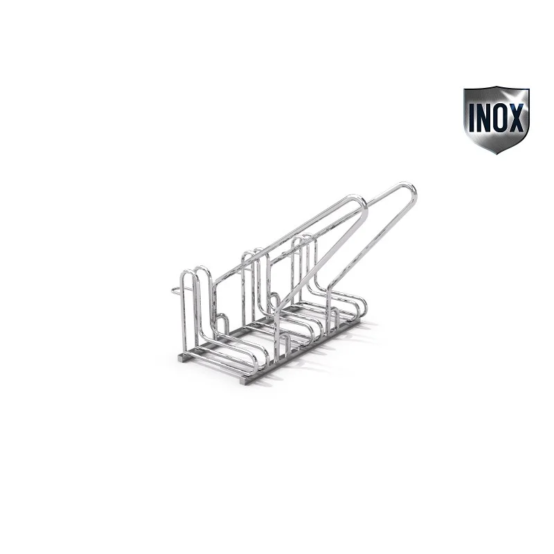 Cykelställ 15 rostfritt stål L-form för park- och stadsmiljö med hållbar konstruktion, funktionell design och låg skötselnivå i daglig drift. Material: rostfritt stål.