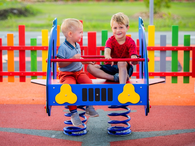 Flygplan är en fjädergunga som låter två barn gunga tillsammans i fram- och bakåtrörelser. Leken stärker balans och kondition, medan flygtemat inspirerar till fantasifulla rollekar.