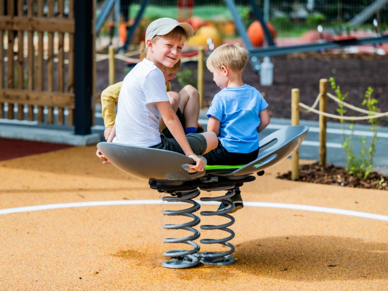 Lilja är en fjädergunga där tre barn kan gunga samtidigt. För att få rörelsen jämn behöver barnen samarbeta, vilket tränar både balans, rytmkänsla och socialt samspel.