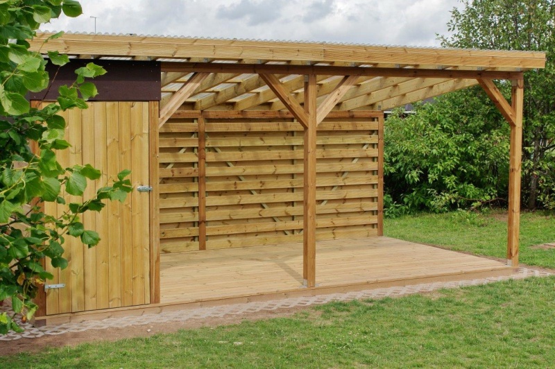 Rymligt förrådsskydd 3×6 m med trägolv i limträ, impregnerat trä och tak i polykarbonat.