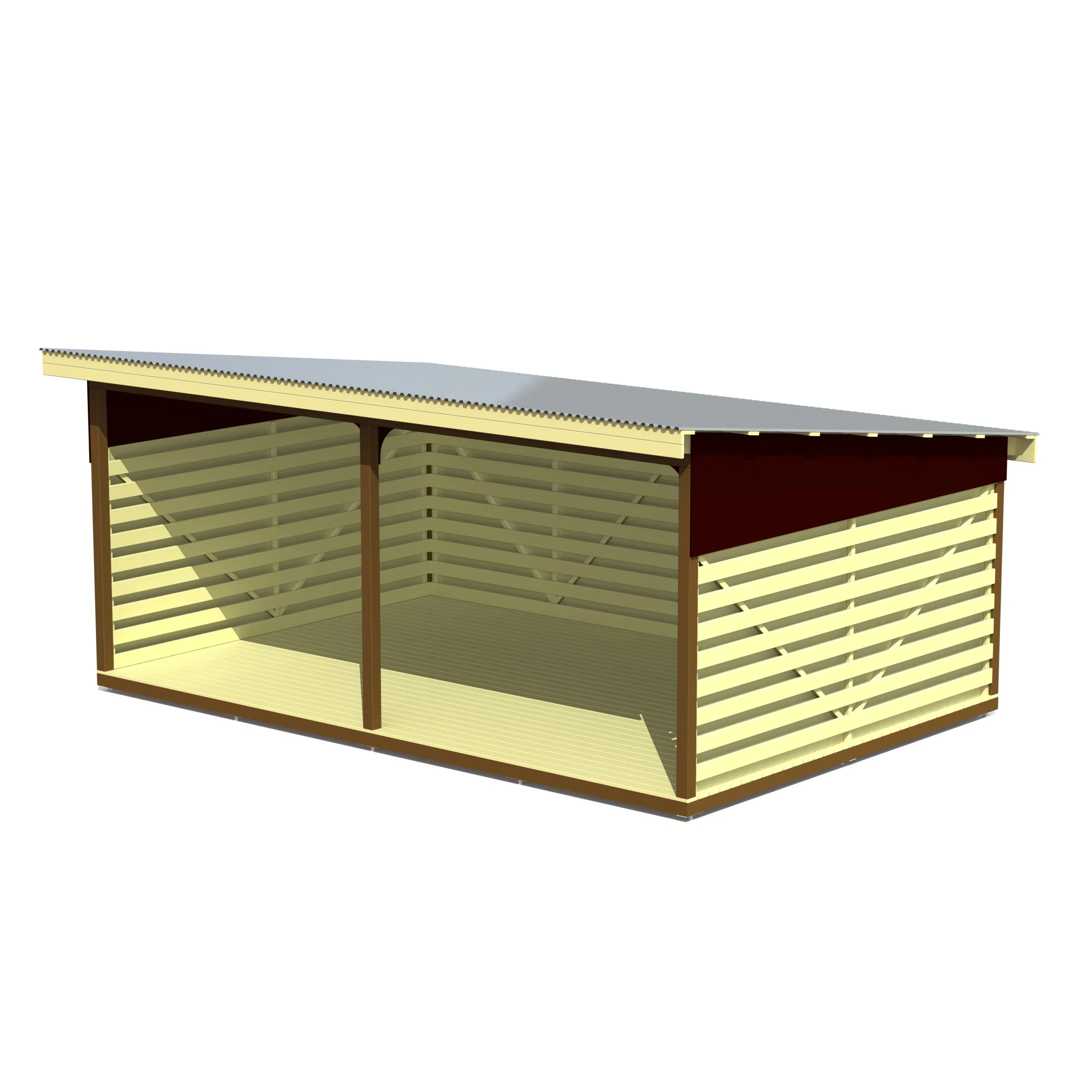 Förrådsskydd 4×6 m med tre väggar i limträ, impregnerat trä och tak i polykarbonat.