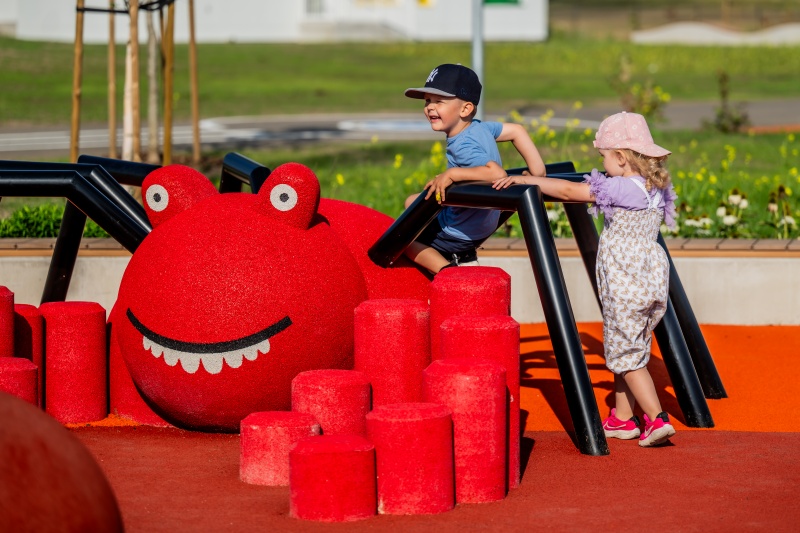 Hållbar 3D-figur gjord av färgat EPDM-granulat och pulverlackerade metalldelar. Fästs på asfalt eller betong med ankarfästen.