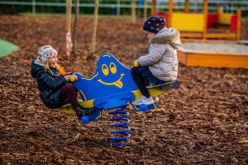 Tvåsitsig gungbräda med handtag och benstöd för trygg lek.
