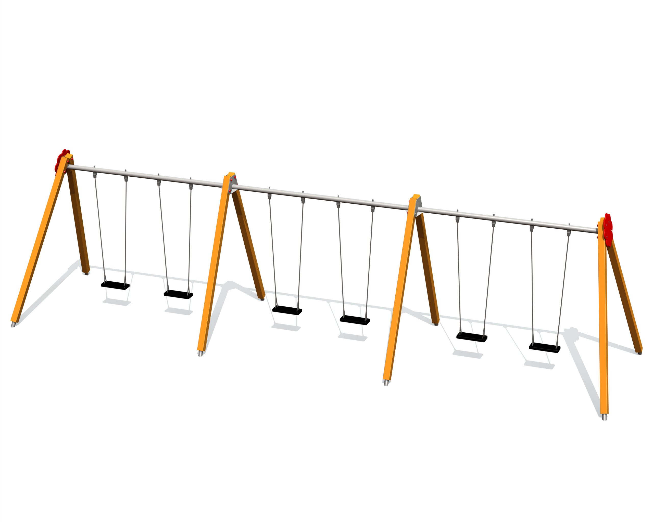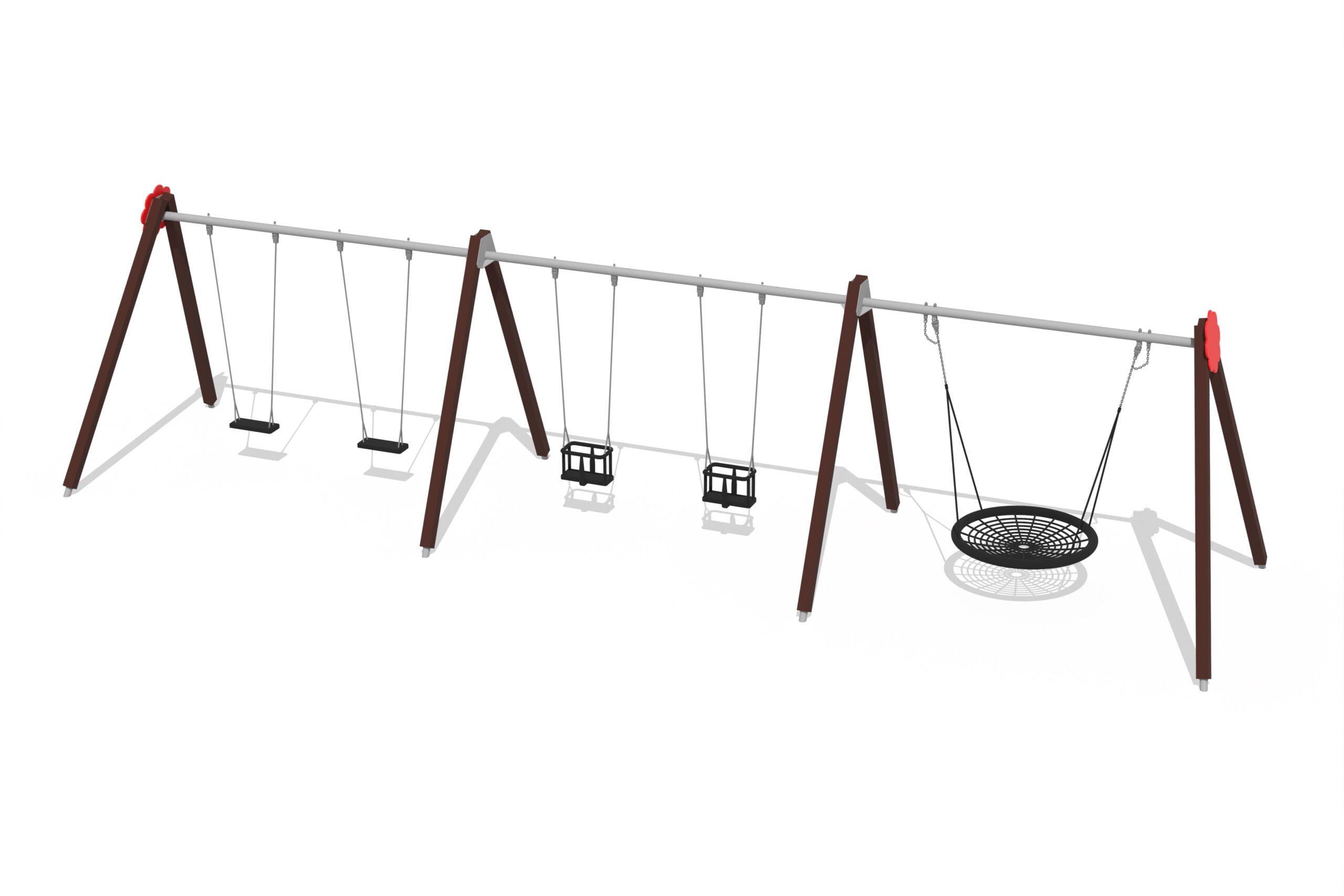 Trippelfack gungställning bell-flower med sex platser som kan kombineras med vaggsitsar, platta sitsar, däcksitsar eller upp till tre fågelbogungor. Gunglek stärker barns motorik, balans, koordination, rumsliga förståelse och muskelstyrka.