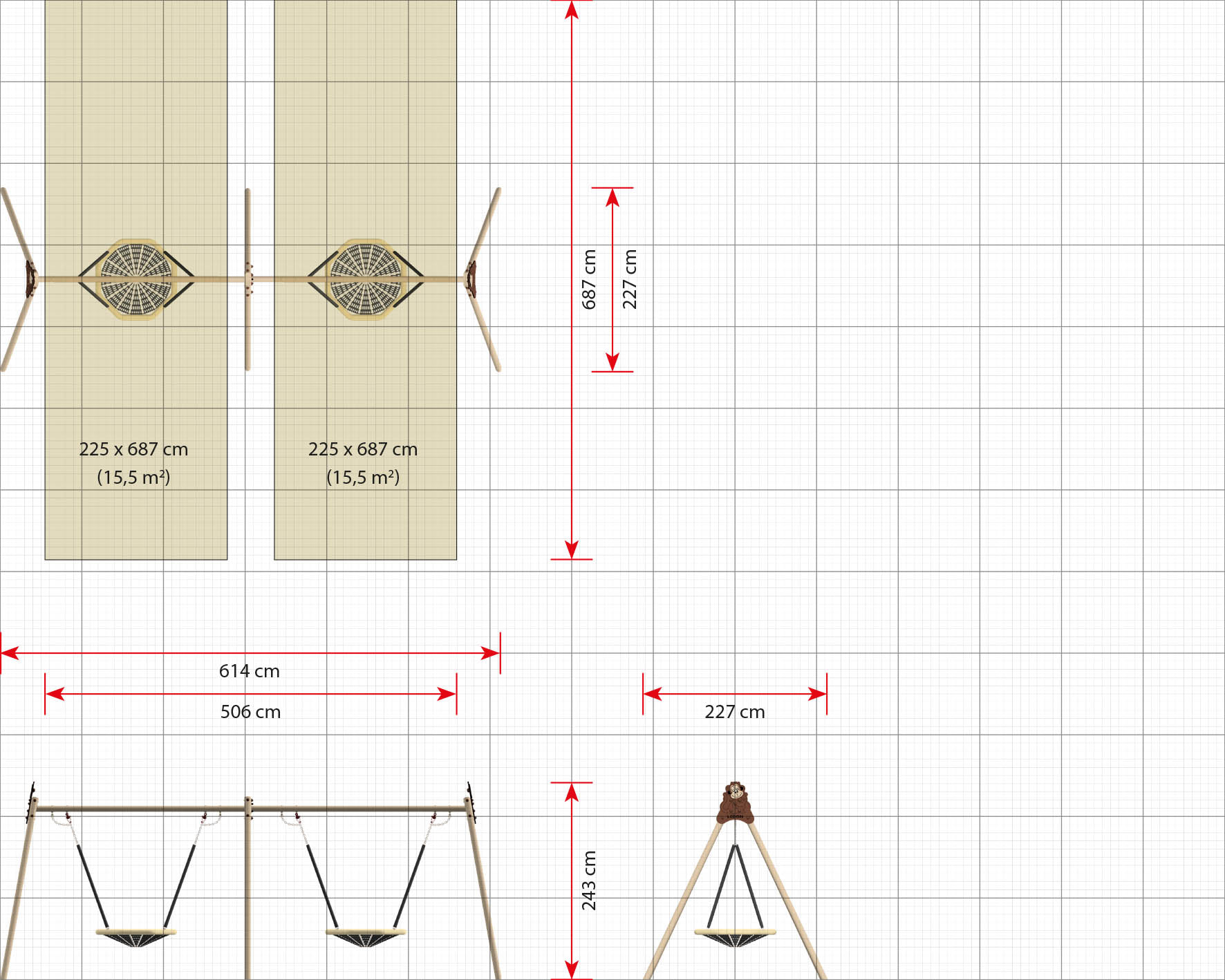 Gungställning Cehan är en hållbar lösning för daglig gunglek i offentlig miljö. Konstruktionen är framtagen för hög belastning och lång livslängd, samtidigt som den skapar en trygg och attraktiv lekpunkt. Gunglek stärker barns rytm, balans och samspel i både fri lek och organiserad aktivitet. Mått (L x B x H): 614 cm x 227 cm x 243 cm. Max fallhöjd: 134 cm. Rekommenderad ålder: Från 1 år.