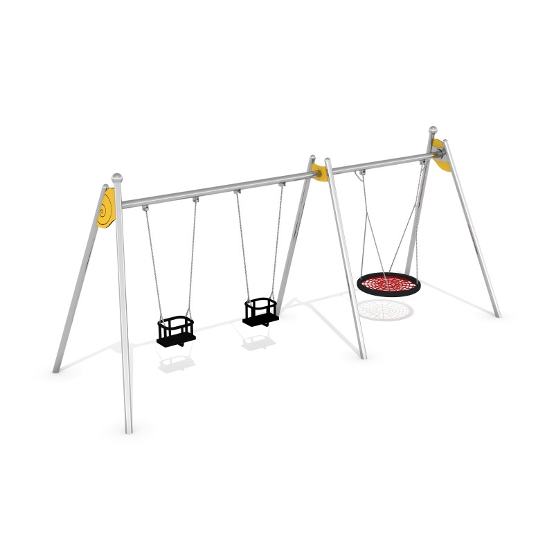 Gungställning KOMBINO 2 för offentlig utemiljö med fokus på säker användning, robust konstruktion och lång livslängd vid daglig drift. Material: rostfritt stål och pulverlackerat stål.