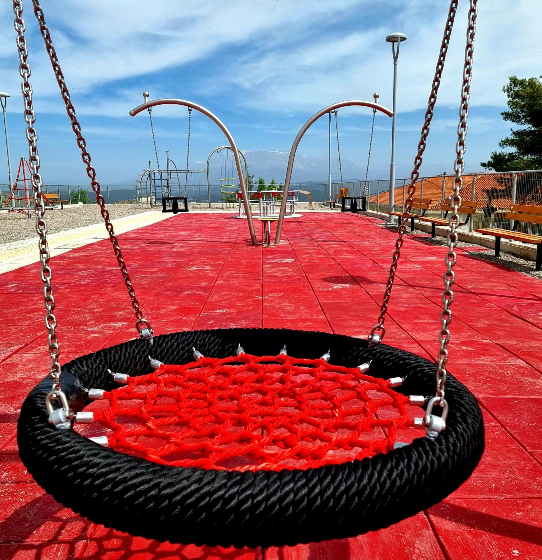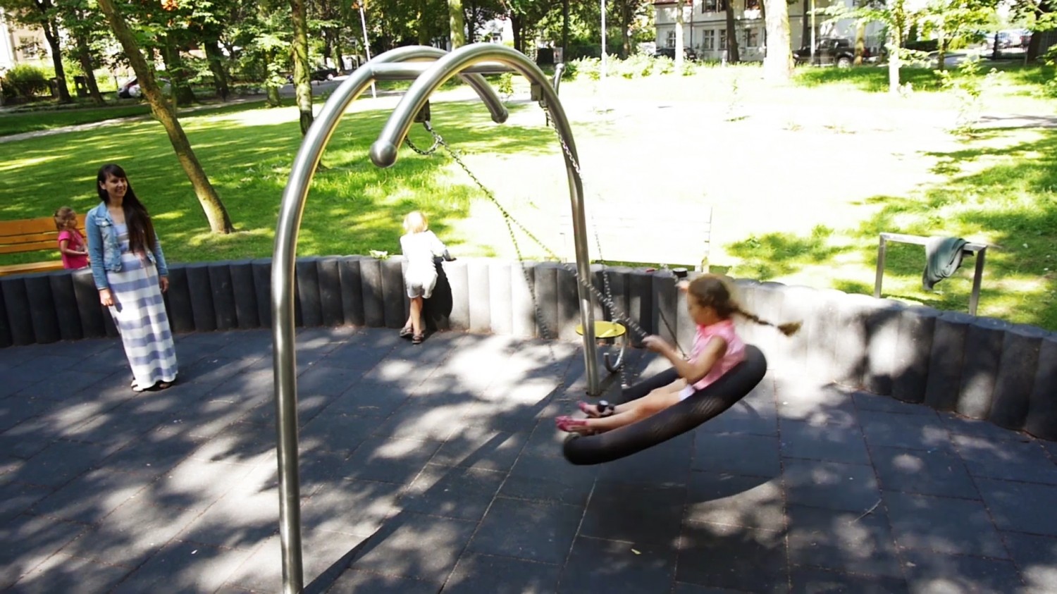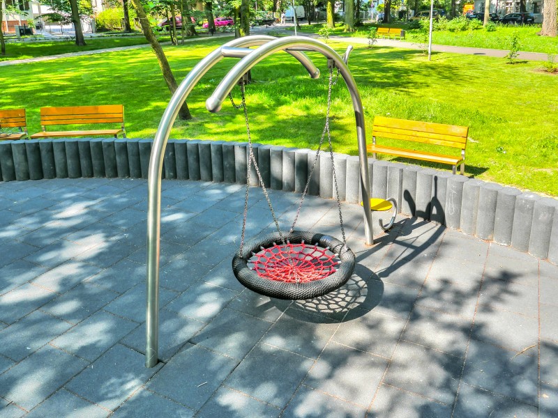Gungställning Sväng BIRDO för offentlig utemiljö med fokus på säker användning, robust konstruktion och lång livslängd vid daglig drift. Material: rostfritt stål och pulverlackerat stål.