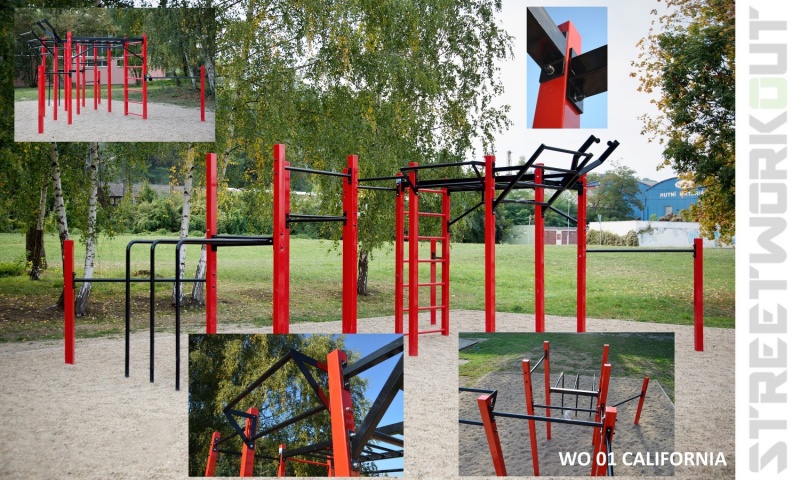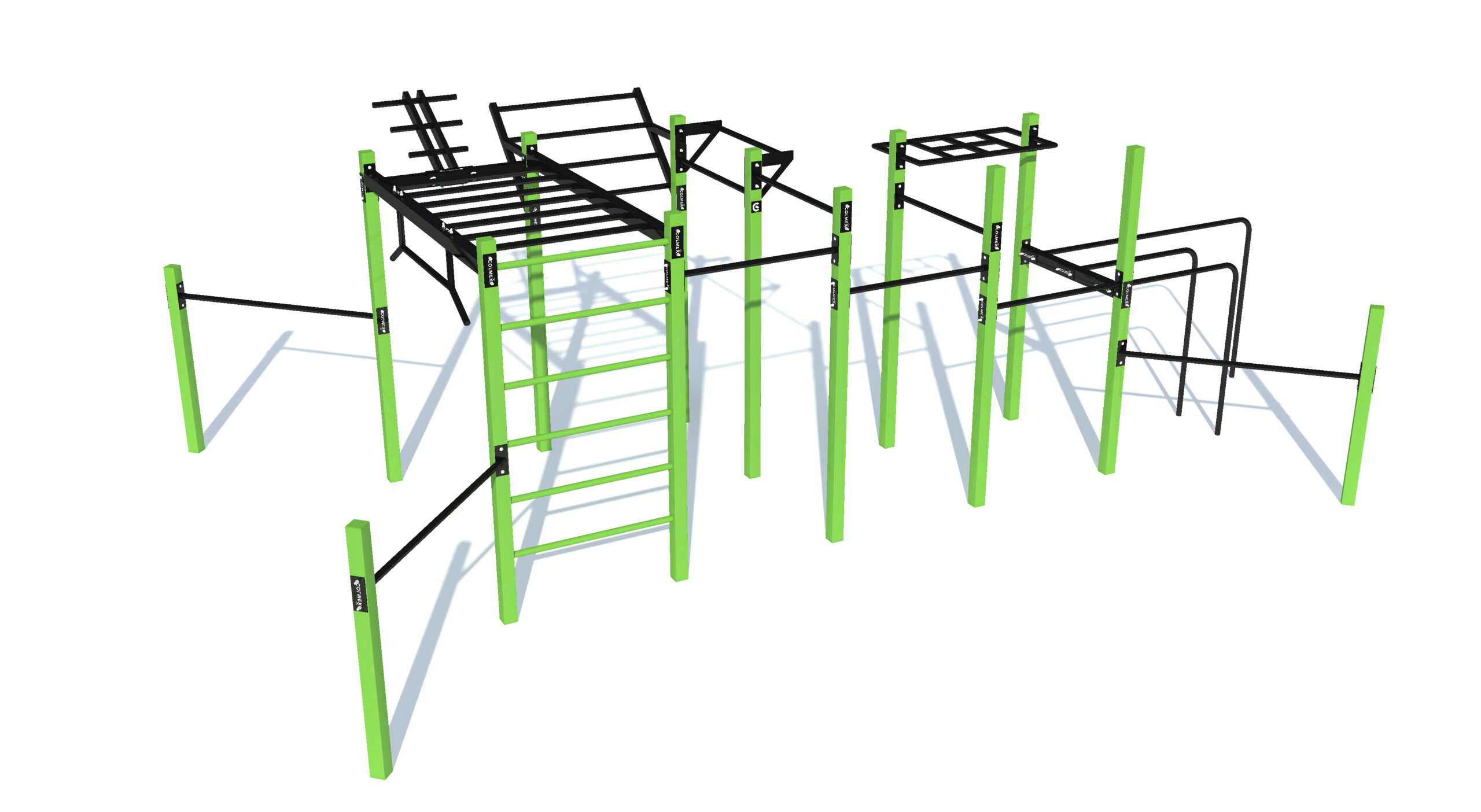 Träningsset som består av två horisontella stegar, en vertikal stege, trippel parallella stänger, monkey bar, två chinsräcken, cross bar samt rygg- och chinsstänger med varierande greppbredder och riktningar. Konstruktionen är tillverkad av vertikala stålprofiler (80×80 mm, 5 mm godstjocklek). Träningsutrustningen är bultmonterad. Material: pulverlackerad metall, varmförzinkning och pulverlackering på begäran. Förankras genom gjutning med möjlighet till ankarbultslösning. TÜV-certifierad enligt EN 16630:2015.