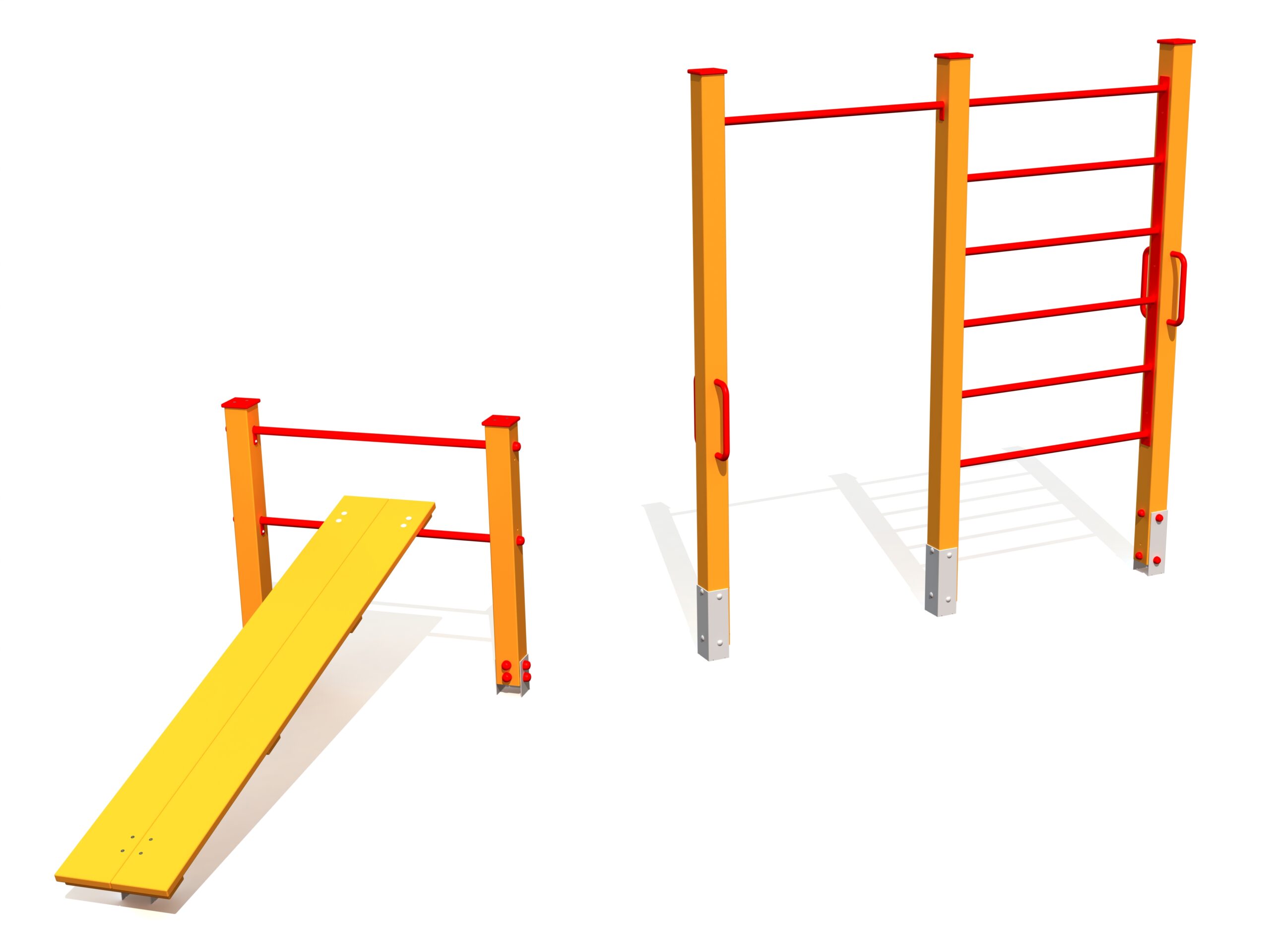Detta kompakta träningskomplex består av parallella stänger samt en dubbel hängstång utrustad med hängande ringar och stretchelement. Passar för funktionell träning i mindre utomhusmiljöer.