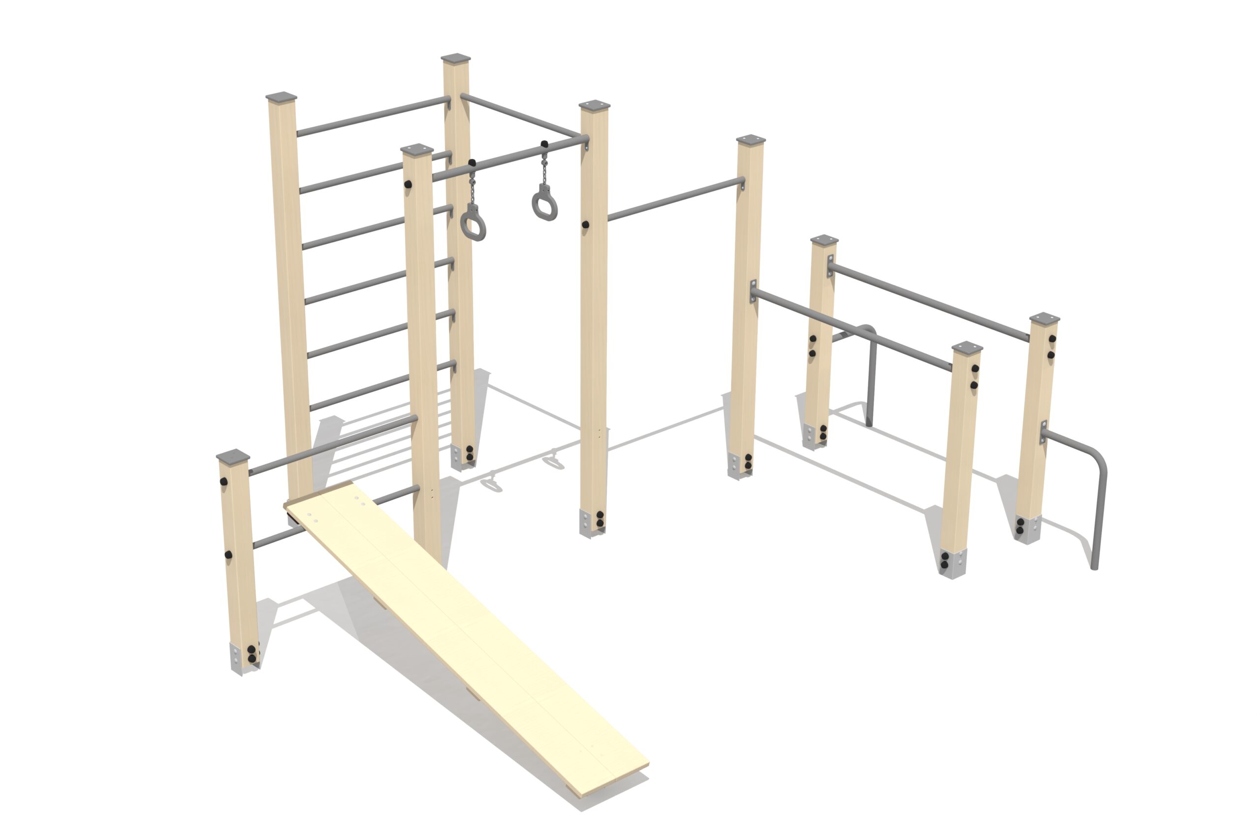 Detta kompakta träningskomplex utomhus består av parallella stänger, klätterstege, magträningsutrustning samt hängstång, inklusive en hängstång utrustad med hängande ringar. Passar för varierad och funktionell träning.