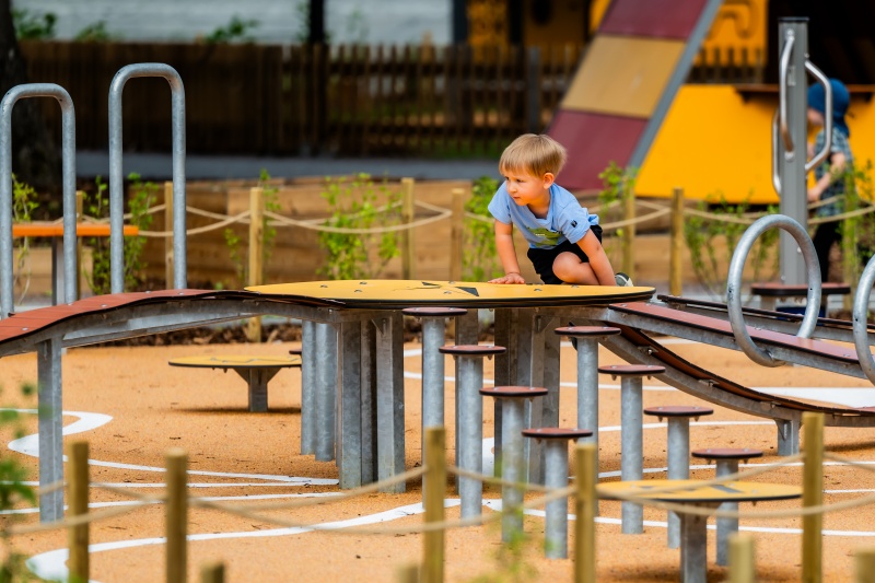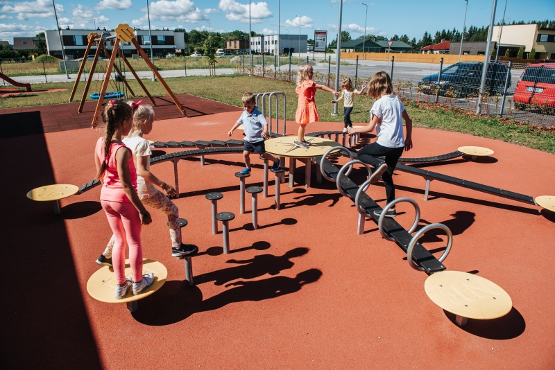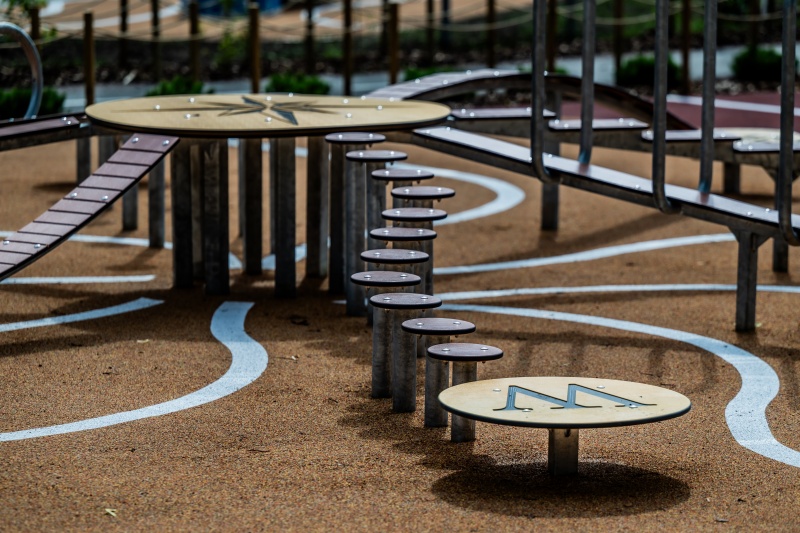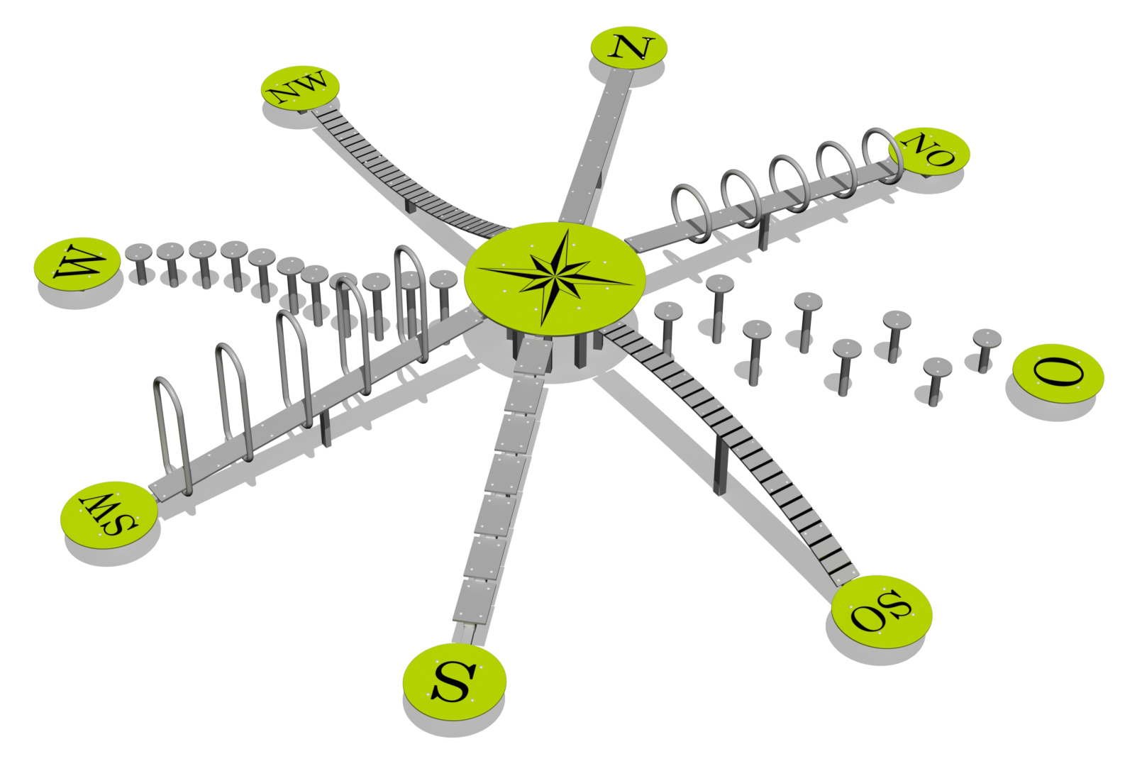 På balanseringsutrustningen Kompass tränar barn koordination och balans samtidigt som de lär sig kardinalriktningar. En initial som anger riktning är inristad i den första plattan på varje spår. Totalt finns åtta olika balans- och krypspår, där varje spår installeras i riktning mot motsvarande väderstreck. Bilderna är illustrativa. Bryggorna är tillverkade av gummibelagd HDPE med halkskyddsplast.