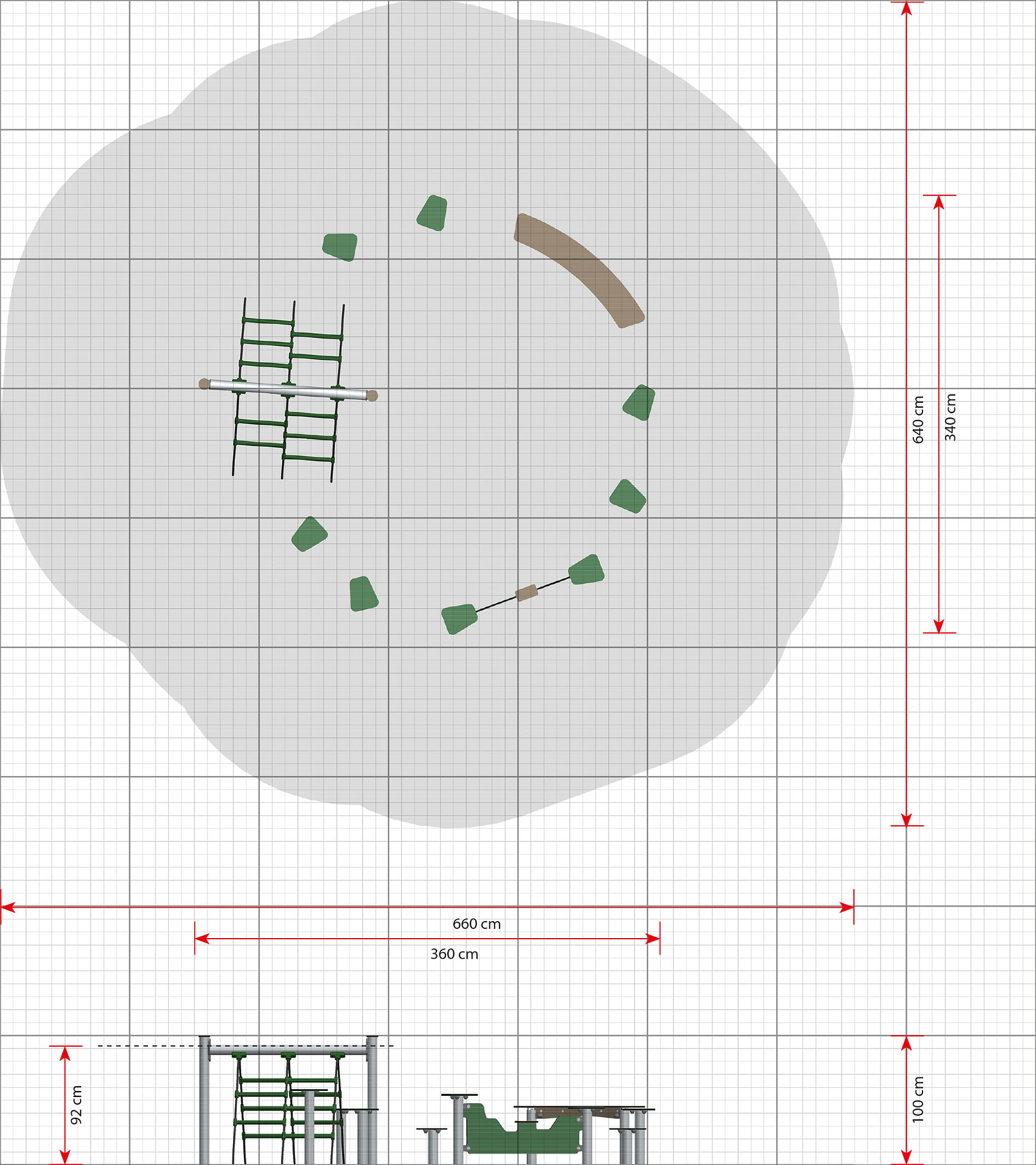 Hinderbana Lokel kombinerar flera rörelsemoment och hjälper barn att utveckla koordination, styrka och uthållighet. Produkten passar för lekplatser där aktiv rörelse och utmaning prioriteras. Den är byggd för hög belastning och lång livslängd. Mått (L x B x H): 360 cm x 340 cm x 100 cm. Max fallhöjd: 92 cm. Rekommenderad ålder: Från 2 år.