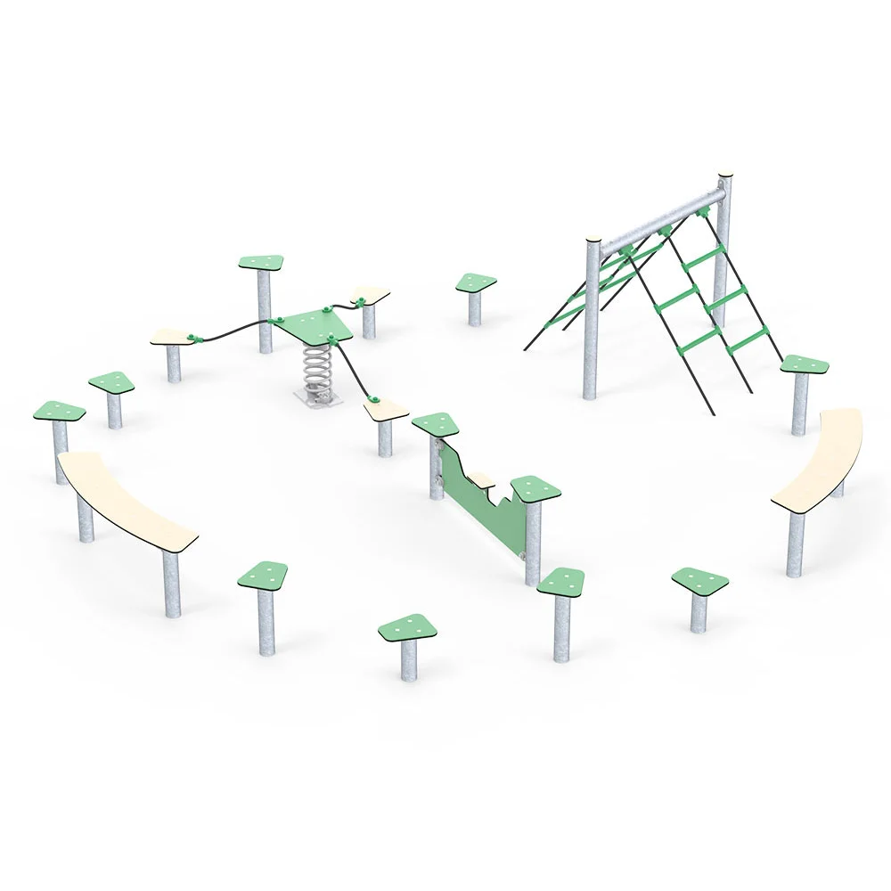 Hinderbana Nelo kombinerar flera rörelsemoment och hjälper barn att utveckla koordination, styrka och uthållighet. Produkten passar för lekplatser där aktiv rörelse och utmaning prioriteras. Den är byggd för hög belastning och lång livslängd. Mått (L x B x H): 470 cm x 430 cm x 100 cm. Max fallhöjd: 92 cm. Rekommenderad ålder: Från 2 år.