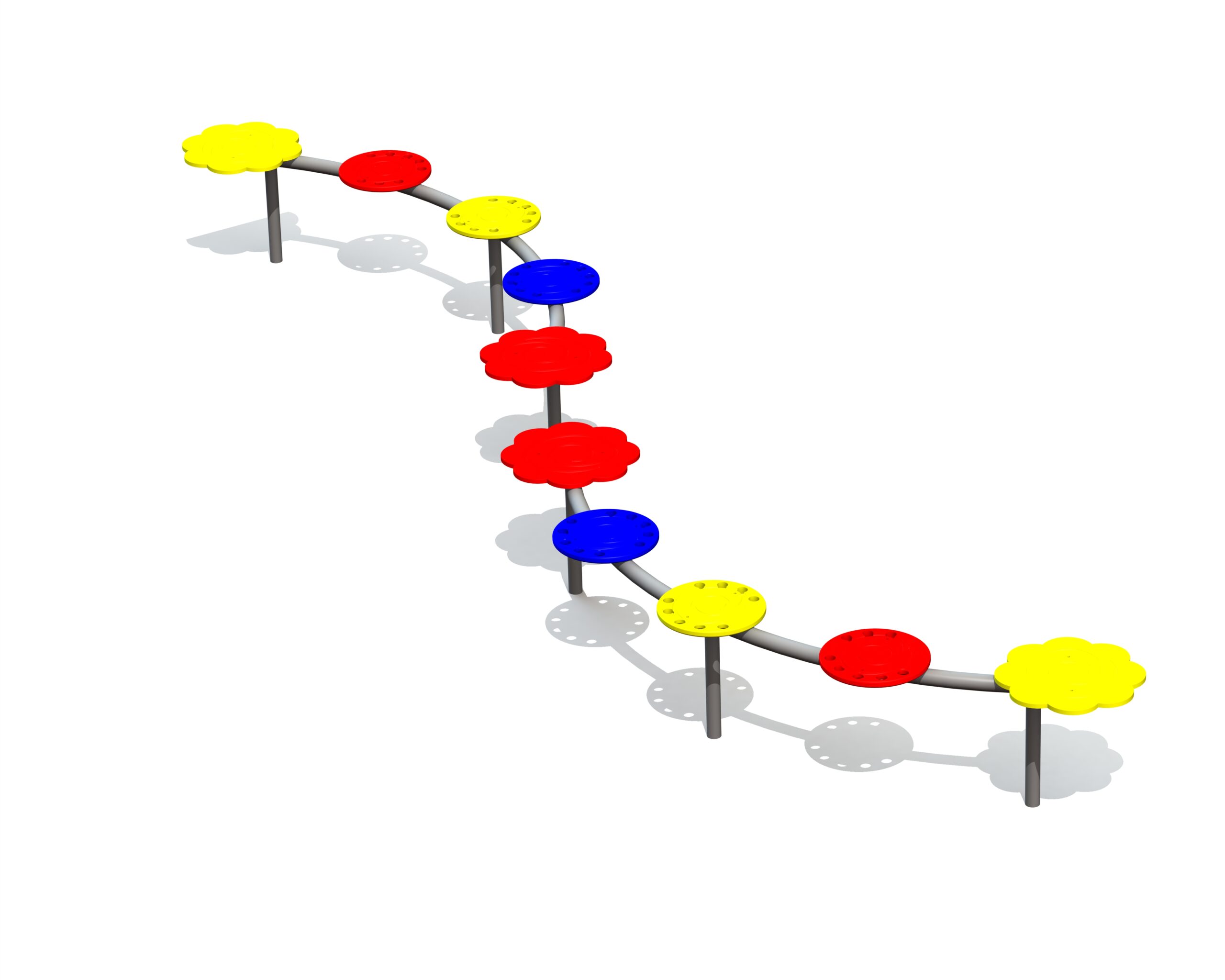 Spiralbalken med färgade skivor tränar balans och koordination. Skivorna kan även användas som sittplatser och innehåller hål som hjälper barn att lära sig siffror.