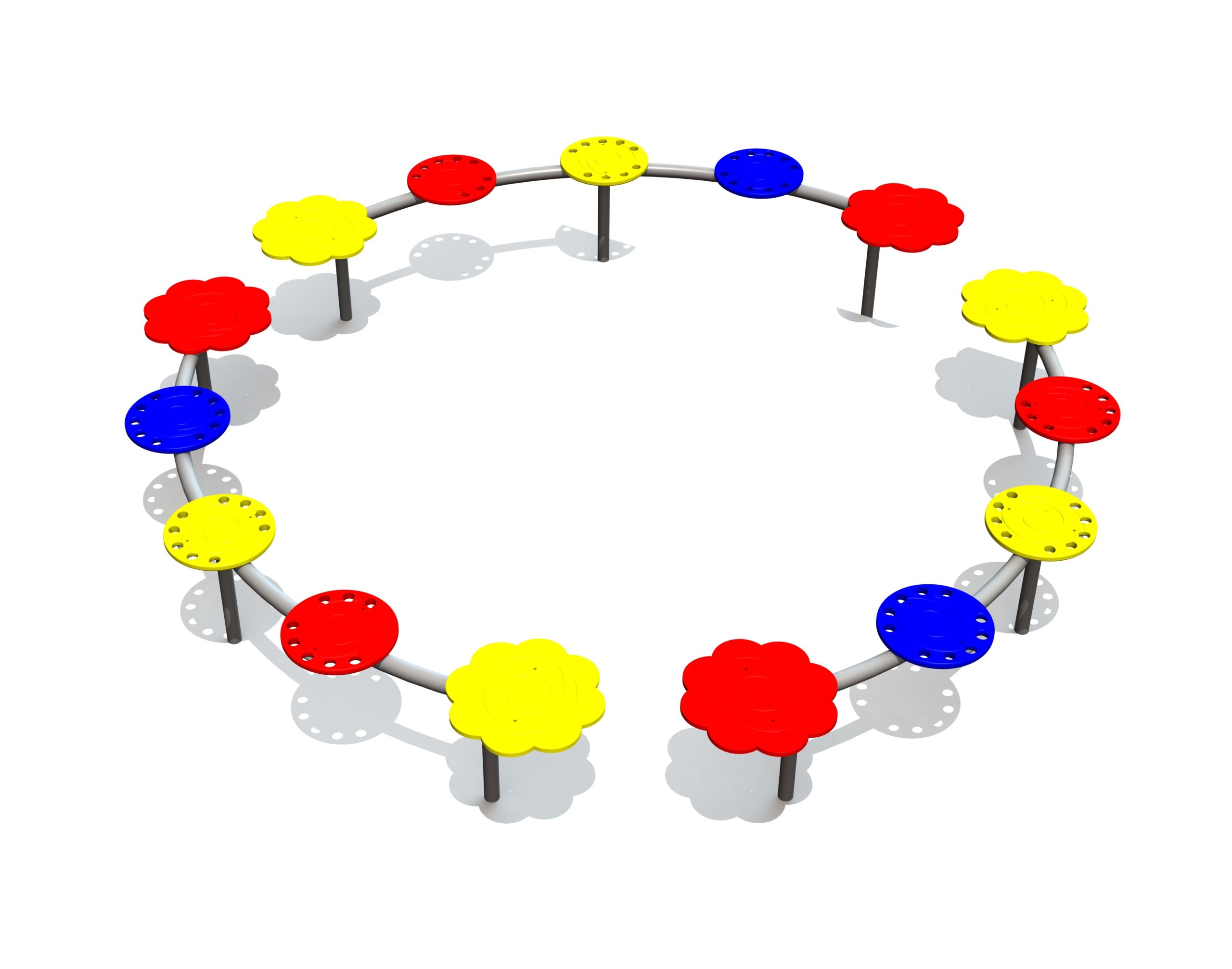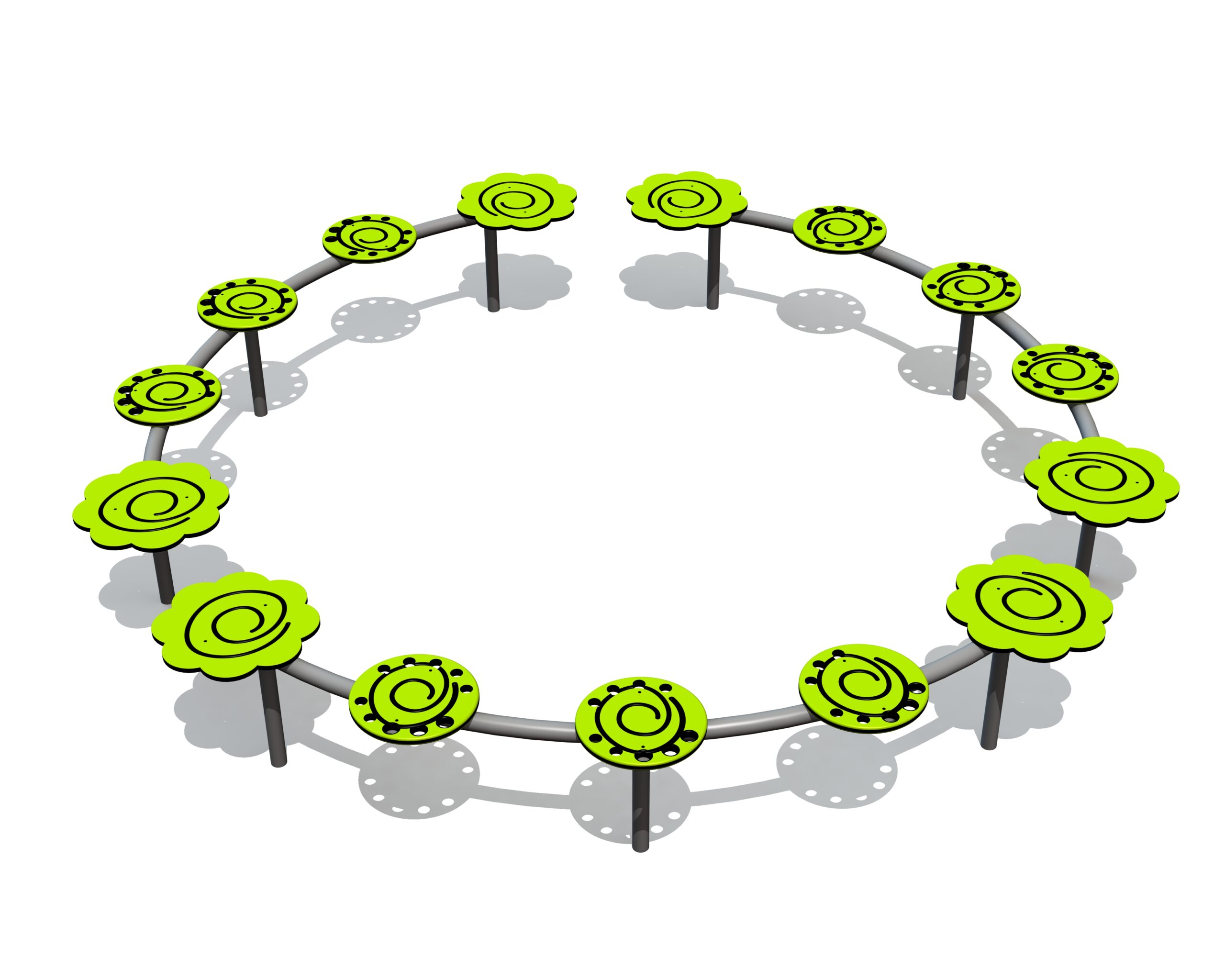 Spiralbalken med färgade skivor tränar balans och koordination. Skivorna kan även användas som sittplatser och är försedda med hål som hjälper barn att lära sig siffror.