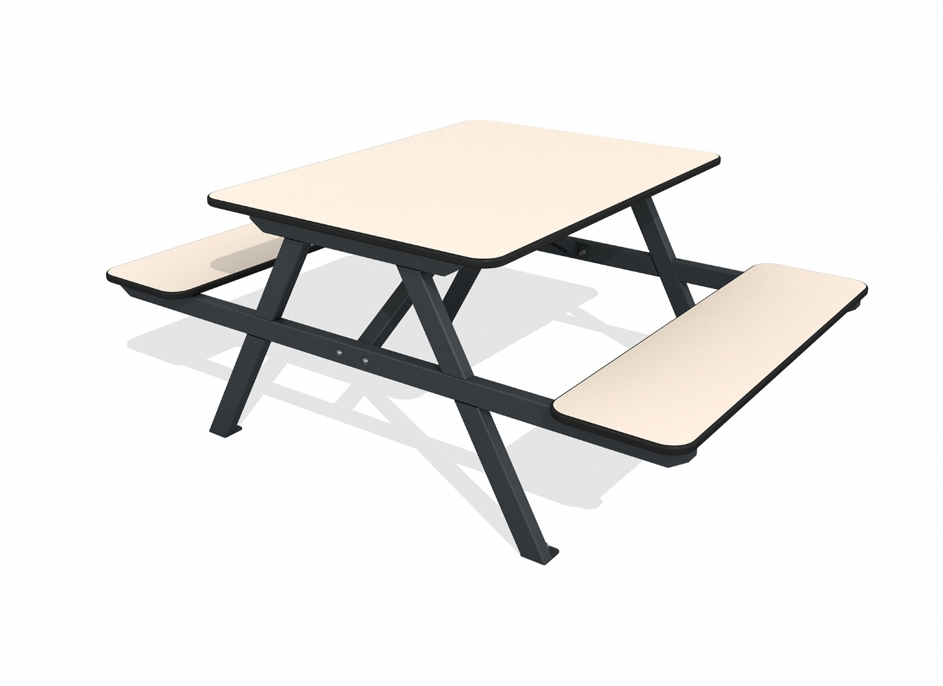 Inomhusmöbel Yror i metallprofil och trä för offentlig miljö.