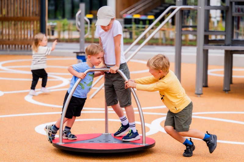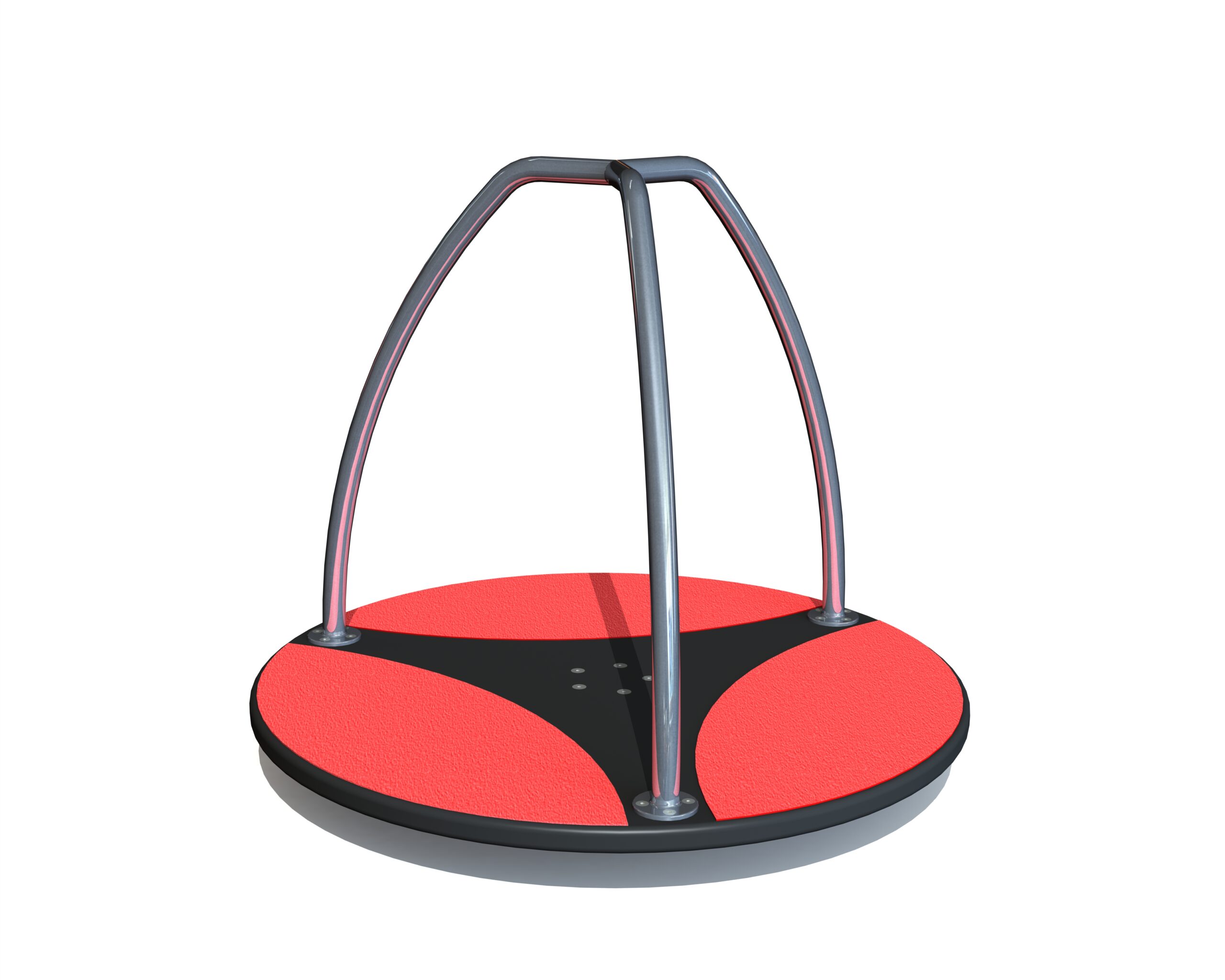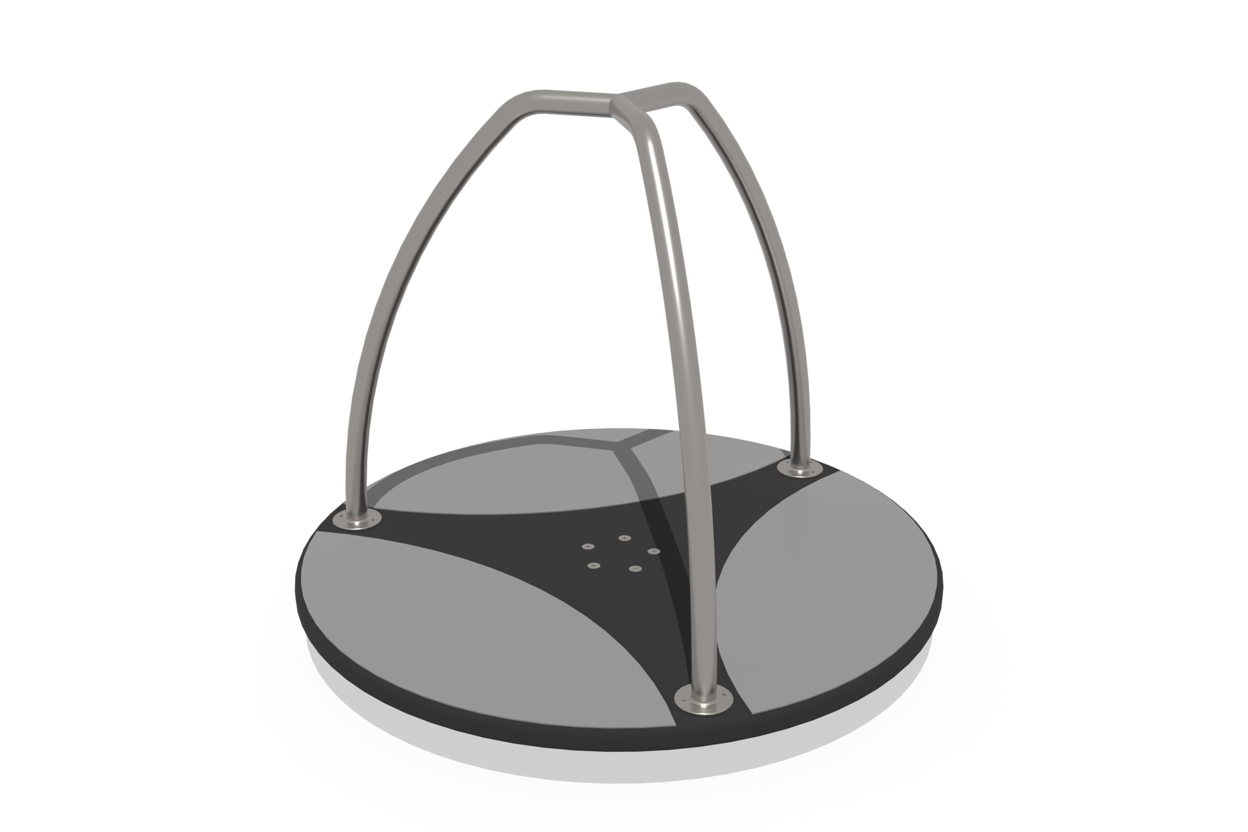 Ståkarusell med metallhandtag för trygg snurrlek.