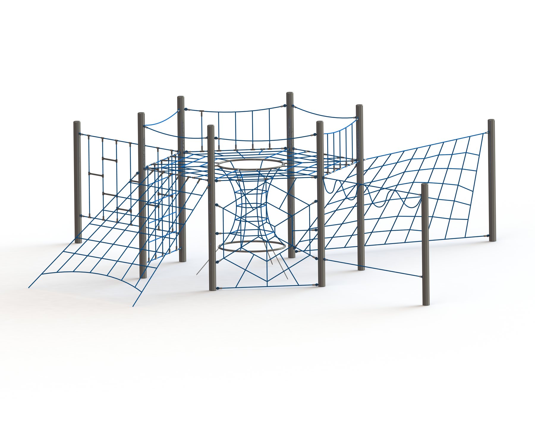 Klätterställning Alanel i rostfritt stål, HDPE och polyesterrep för offentlig miljö.