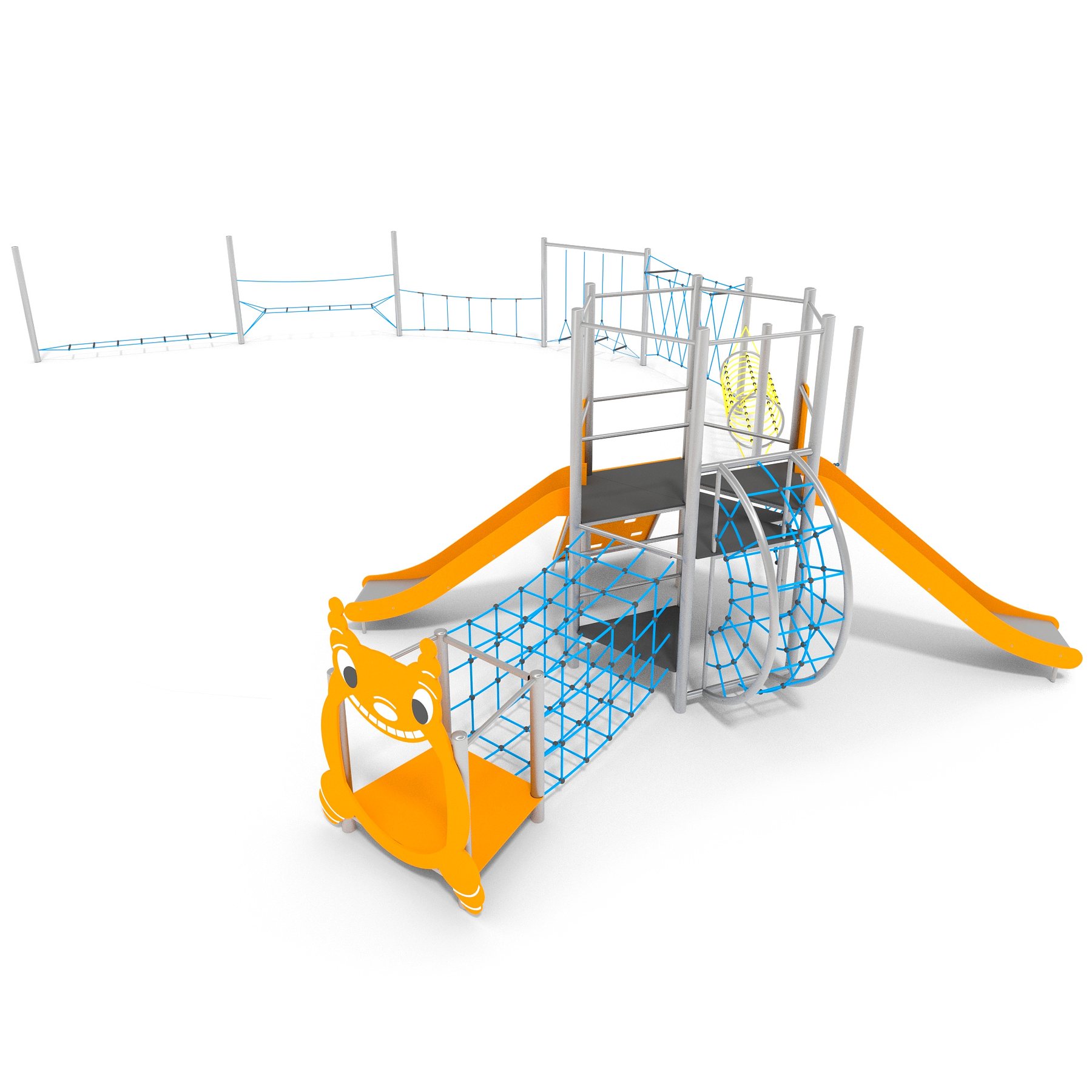 Klätterställning Alelsa i rostfritt stål, HDPE och polyesterrep för offentlig miljö.