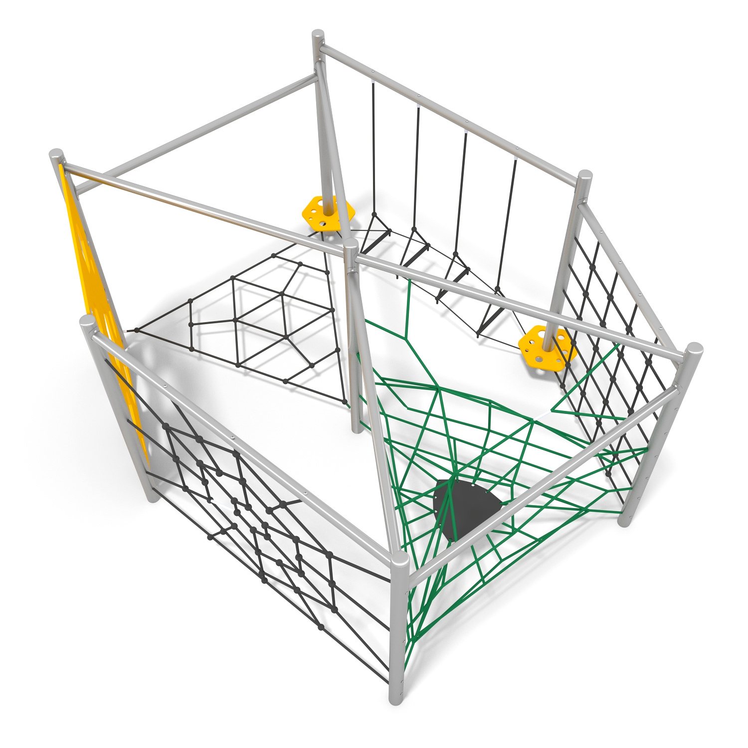 Klätterställning Alelus i rostfritt stål, HDPE och polyesterrep för offentlig miljö.