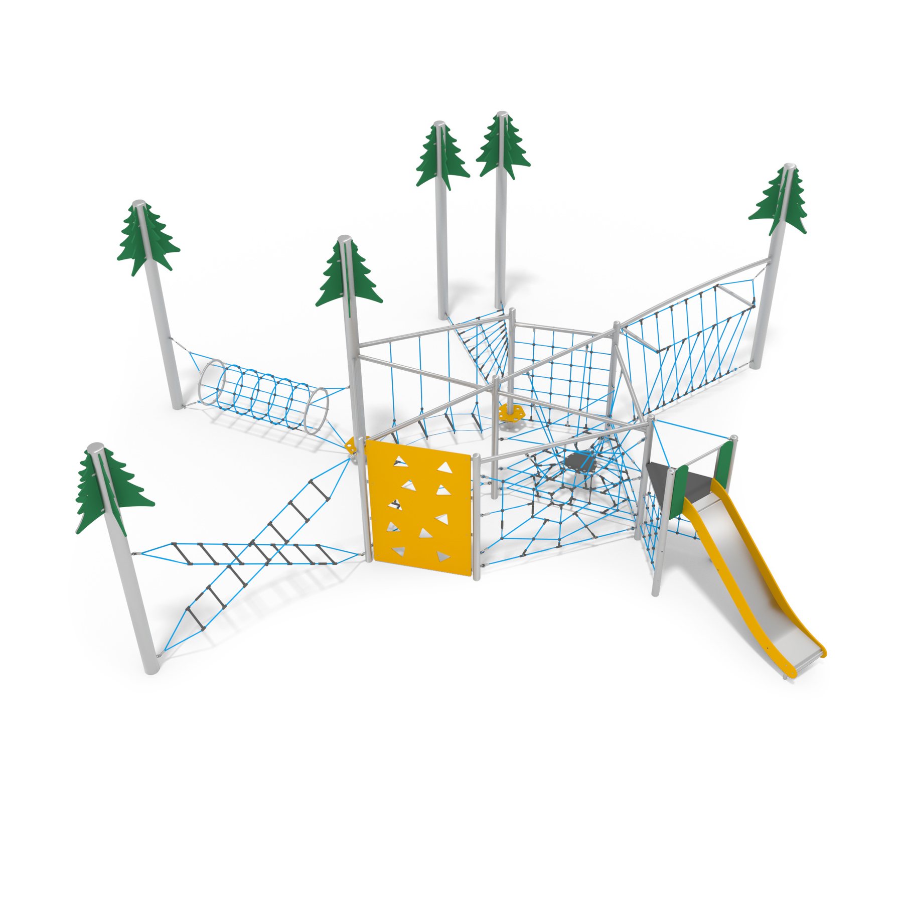 Klätterställning Alen i rostfritt stål, HDPE och polyesterrep för offentlig miljö.
