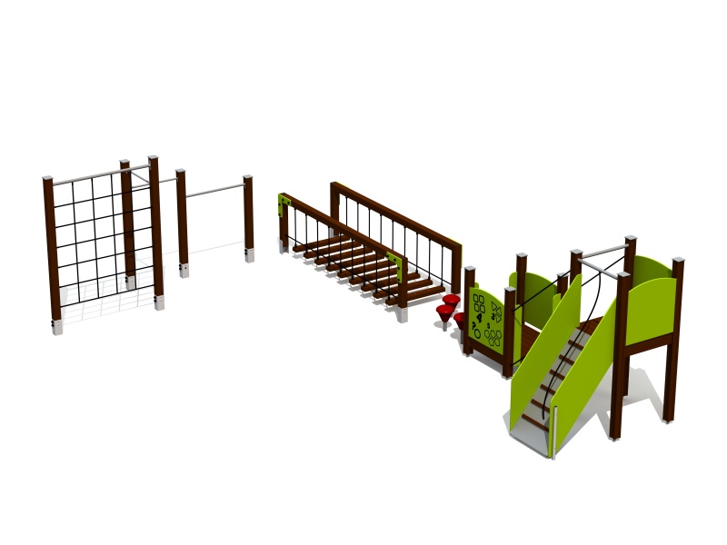 Variationsrik klätterlek med flera element för rörelse, balans och styrka.