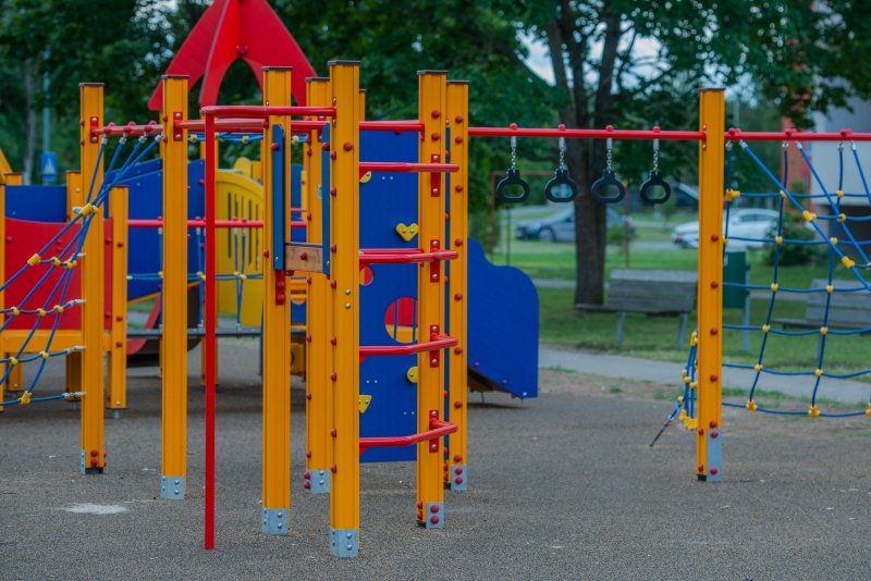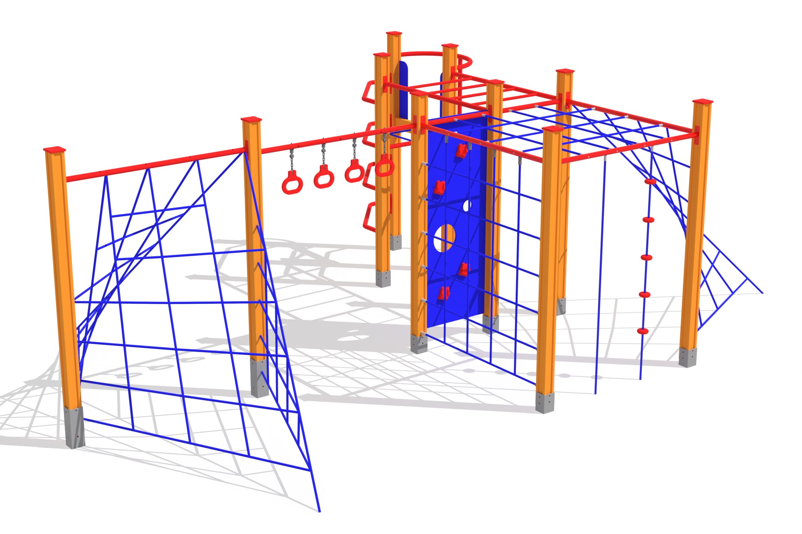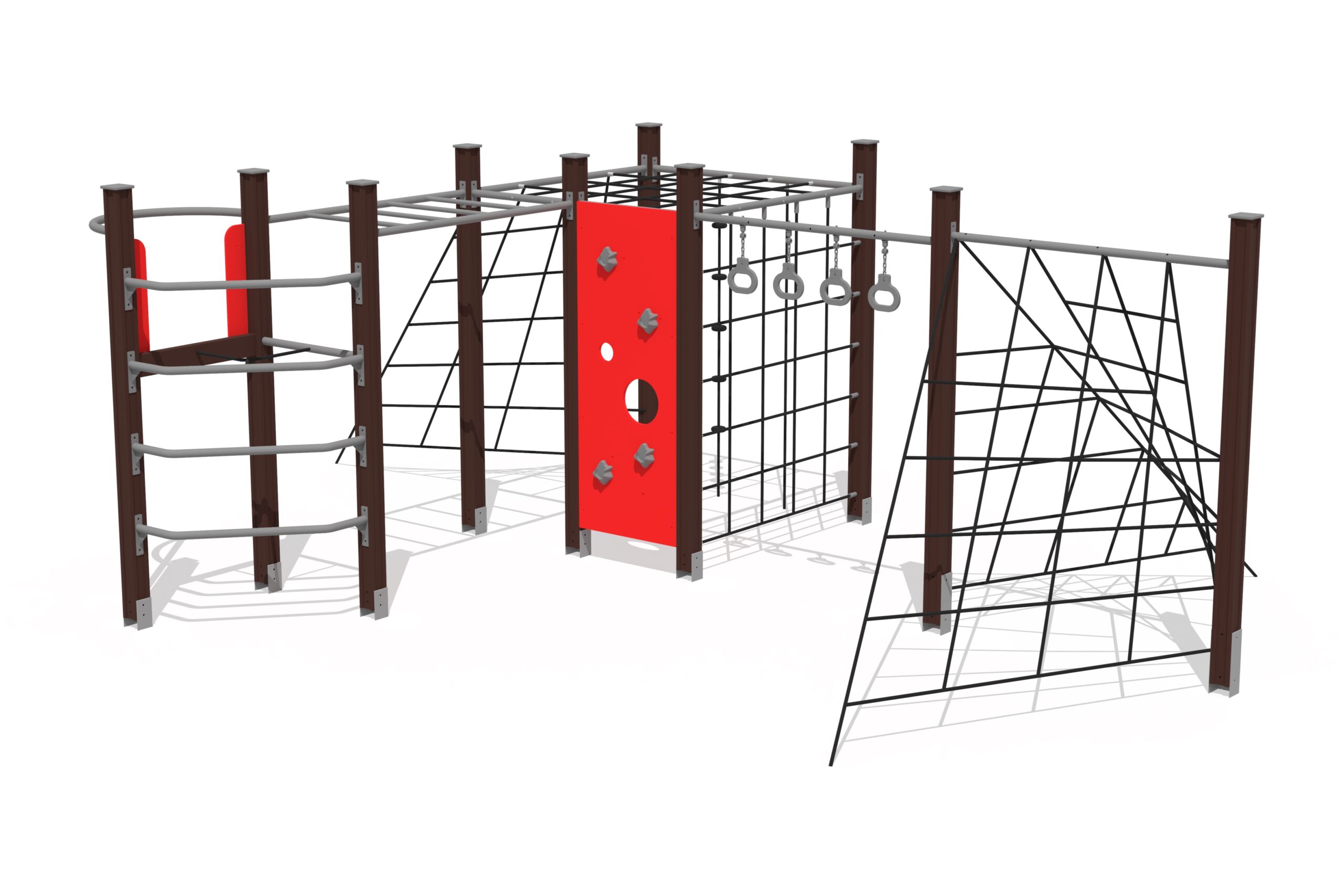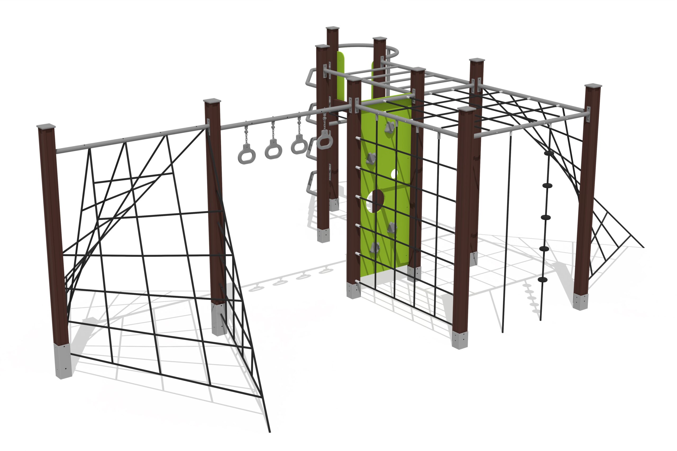 Stort klättringskomplex med nät, ringar och flera klätterelement för aktiv lek.