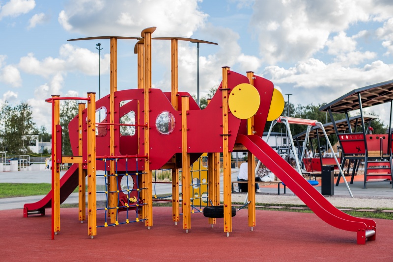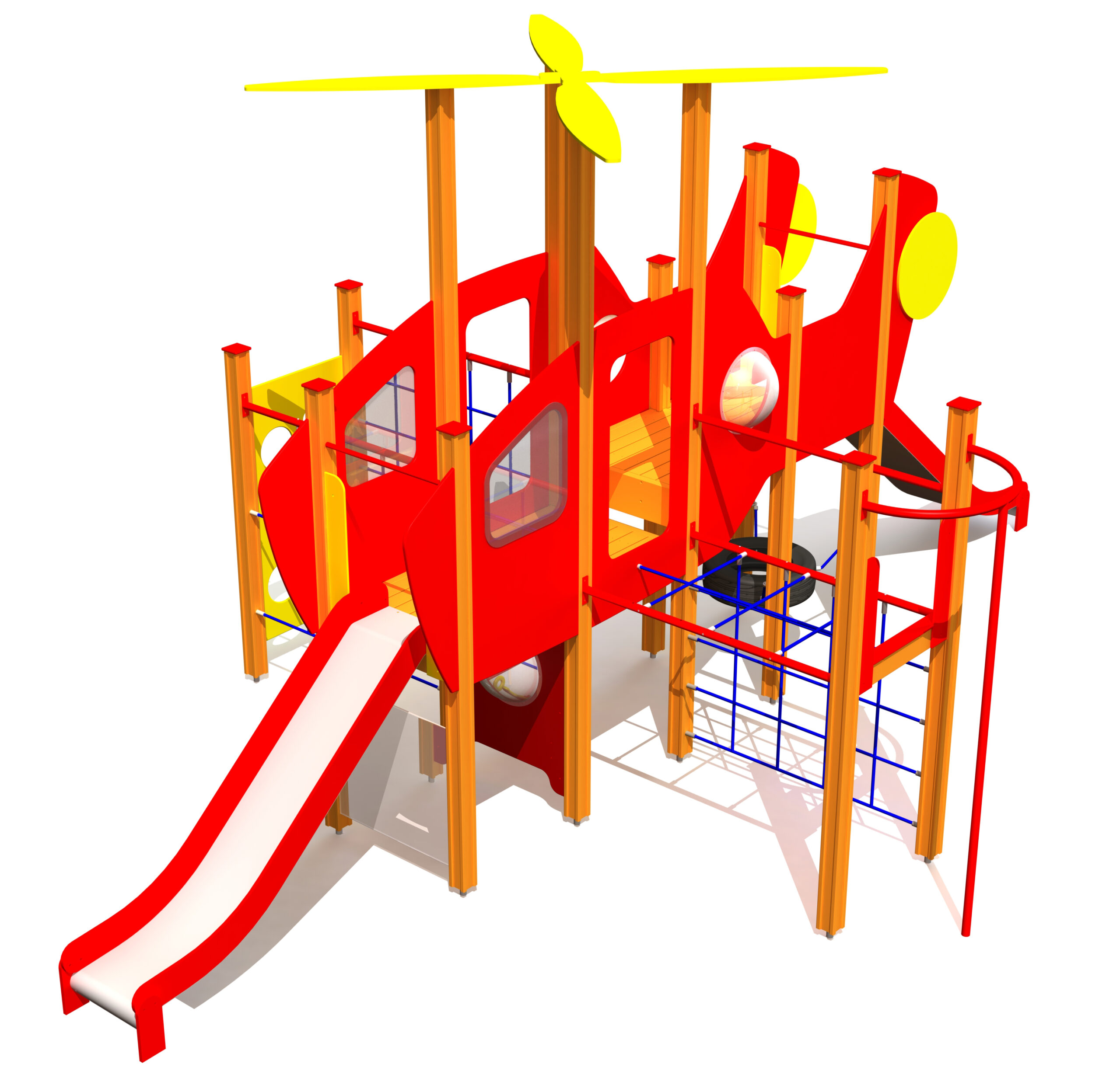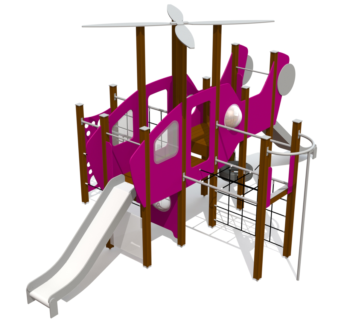 Helikoptern är en lekstruktur med rutschkanor, klätterväggar och plattformar som erbjuder barn en mängd olika aktiviteter. Den tematiska utformningen stimulerar kreativ lek och fantasifulla rollspel. Produkten är utrustad med en sittbrunn med vridbar ratt och växelspakar samt ett bakre utrymme där barn kan leka vidare som besättning mellan flygningarna.