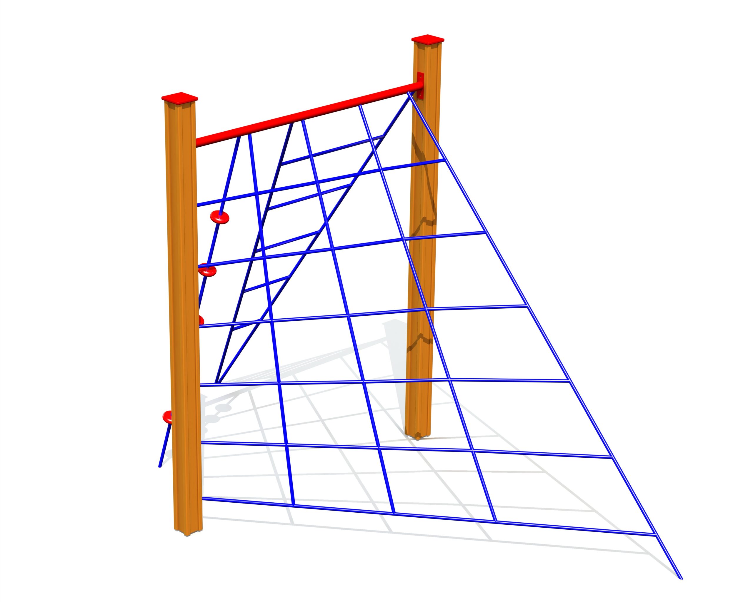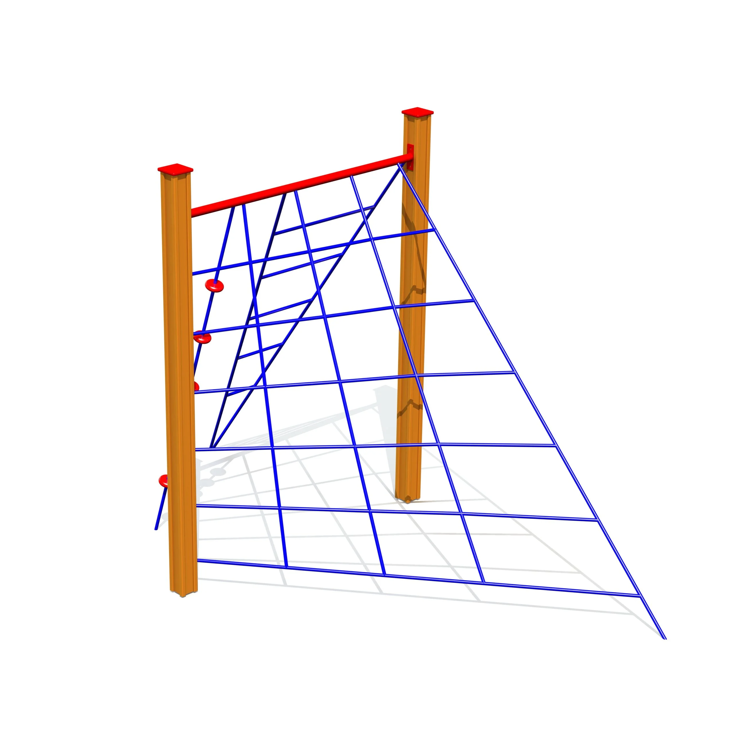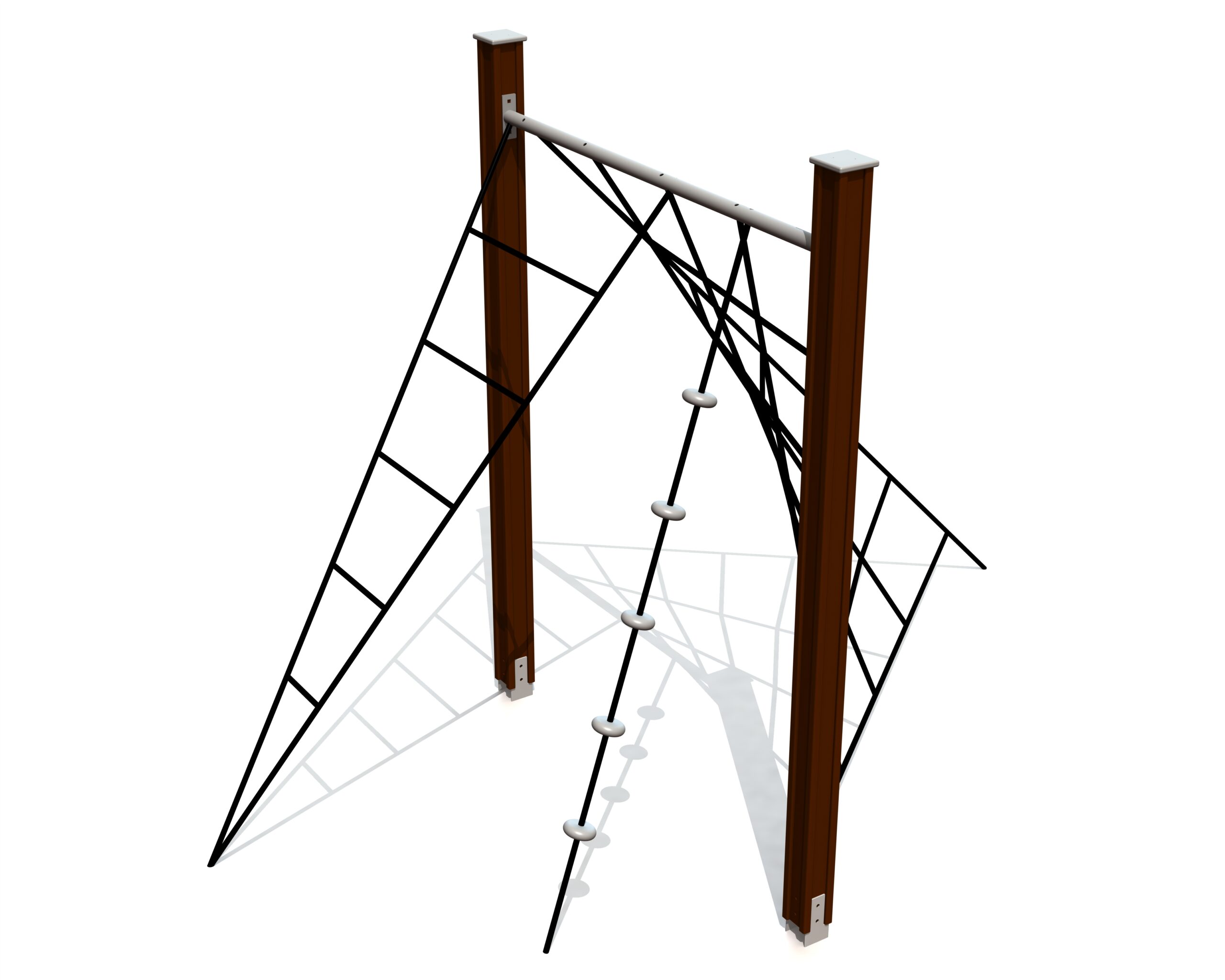 Klätterlösning med diagonala nät och klätterrep med plattformar för varierad rörelse.