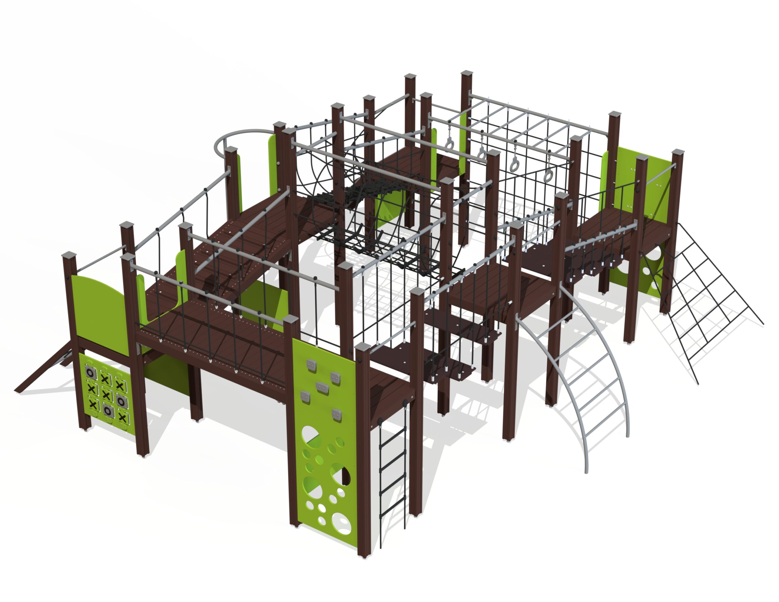Stort klätterkomplex med broar, klätterelement och monkey bars.