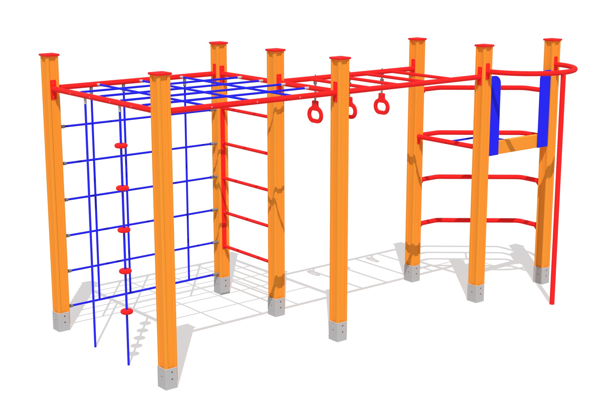 Klätterlösning med stegar, nät och rör samt gymnastikringar för styrketräning.