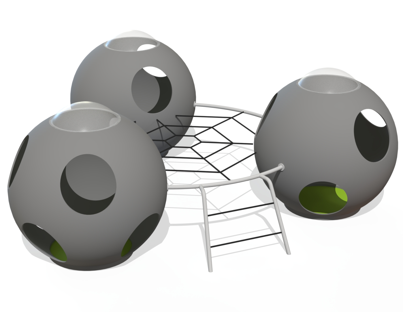 Rymdinspirerad klätterställning med kupoler, nät och stege för lek och gömma-lek.