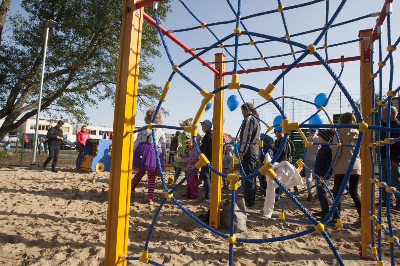 Rektangulär klätterstruktur med kombination av klassiskt klätternät och spindelnät för varierad klätterlek.