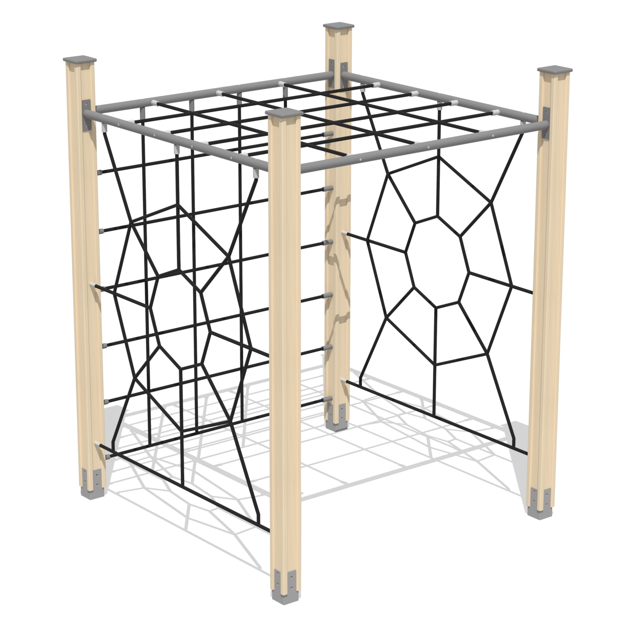 Spindelnät har ett vanligt klätternät på ena sidan och toppen, medan två sidor är täckta med spindelnätsformade klätternät. Konstruktionen utvecklar barns fingerfärdighet, balans och fysiska kondition genom varierad klättring.