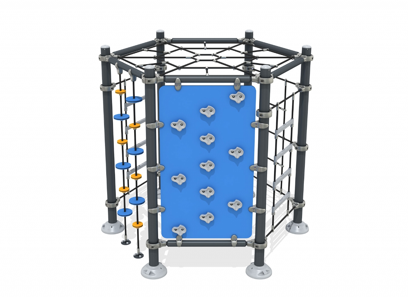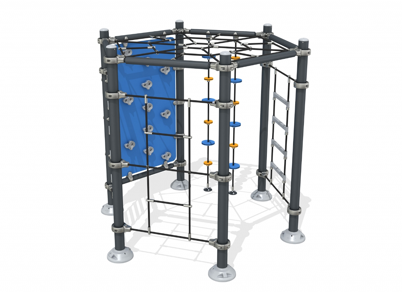 Klätterställning Tora är utvecklad för lekplatser där fokus ligger på klättring, balans och motorisk utveckling. Produkten har bredd 219 cm, djup 193 cm och höjd 197 cm. Specifikationen omfattar säkerhetszon L 587 x W 558. Utförandet i stålvajer, polykarbonat, trä och marinplywood ger en tålig konstruktion som lämpar sig för återkommande användning i krävande miljöer. Den är anpassad för upp till 10 barn och rekommenderad ålder 6-12.