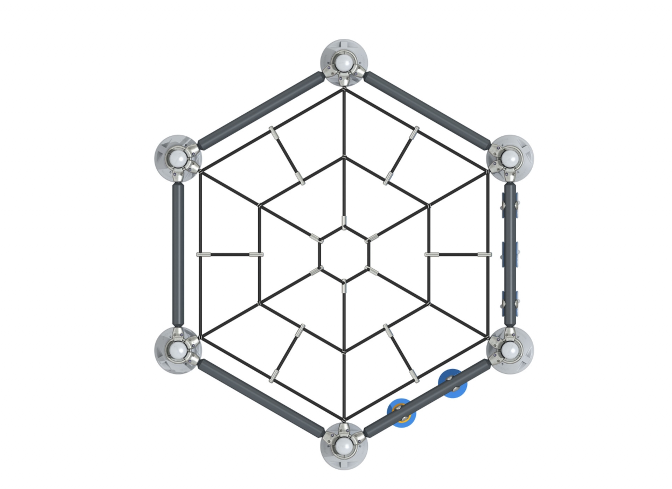 Klätterställning Tora i stålvajer, polykarbonat och trä för offentlig miljö.
