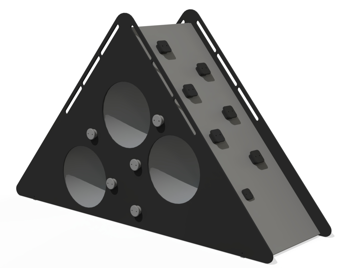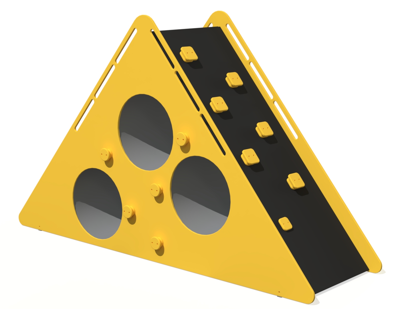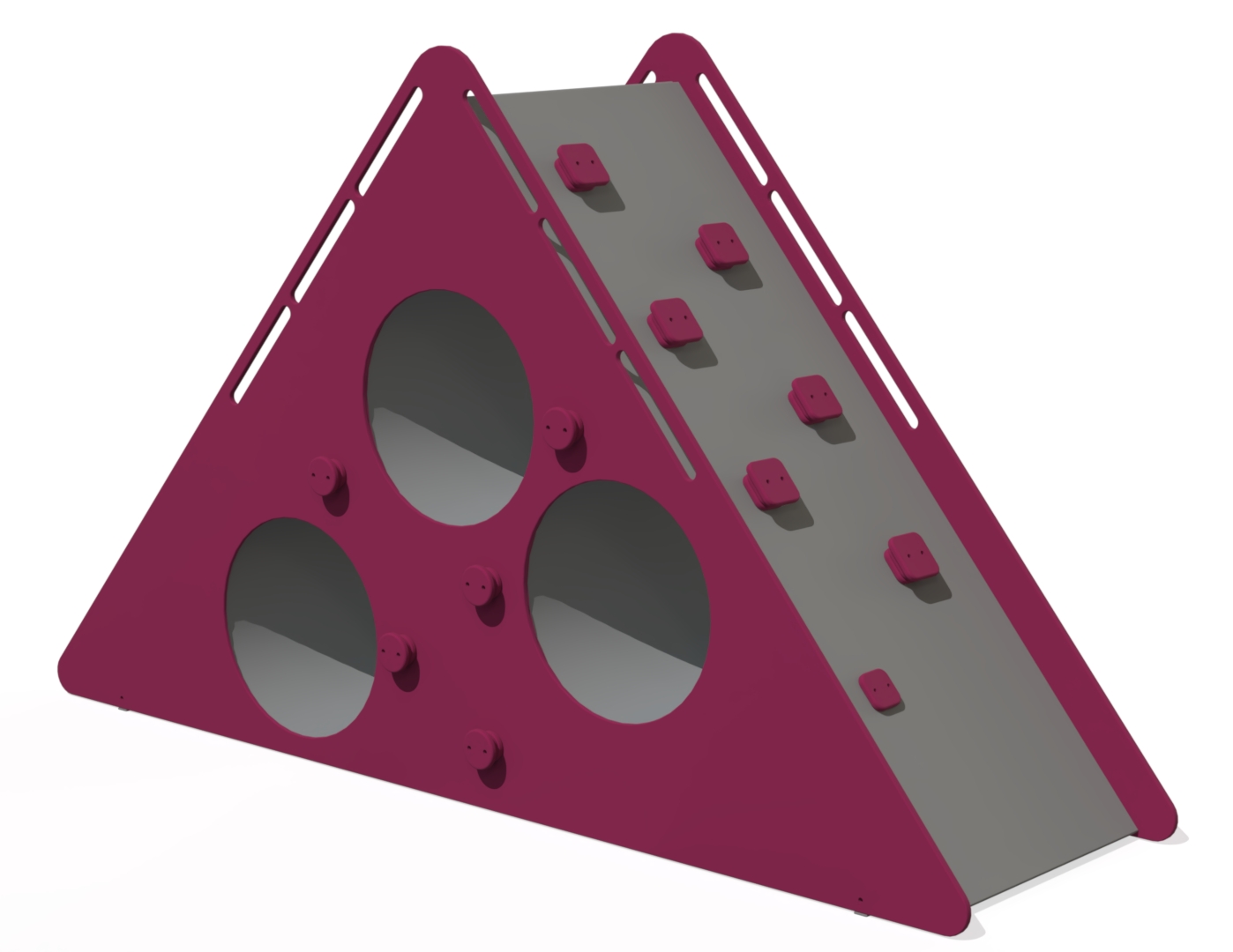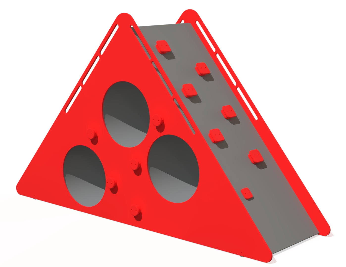 Klätterställning Triangel är utrustad med flera klätterelement som hjälper till att utveckla barns motoriska färdigheter och uppmuntrar till aktiv lek. Tre genomgående tunnlar är placerade på olika höjder, vilket gör konstruktionen lämplig för både yngre och äldre barn. Kombinationen av klättring och kryplekar skapar variation och utmaning.