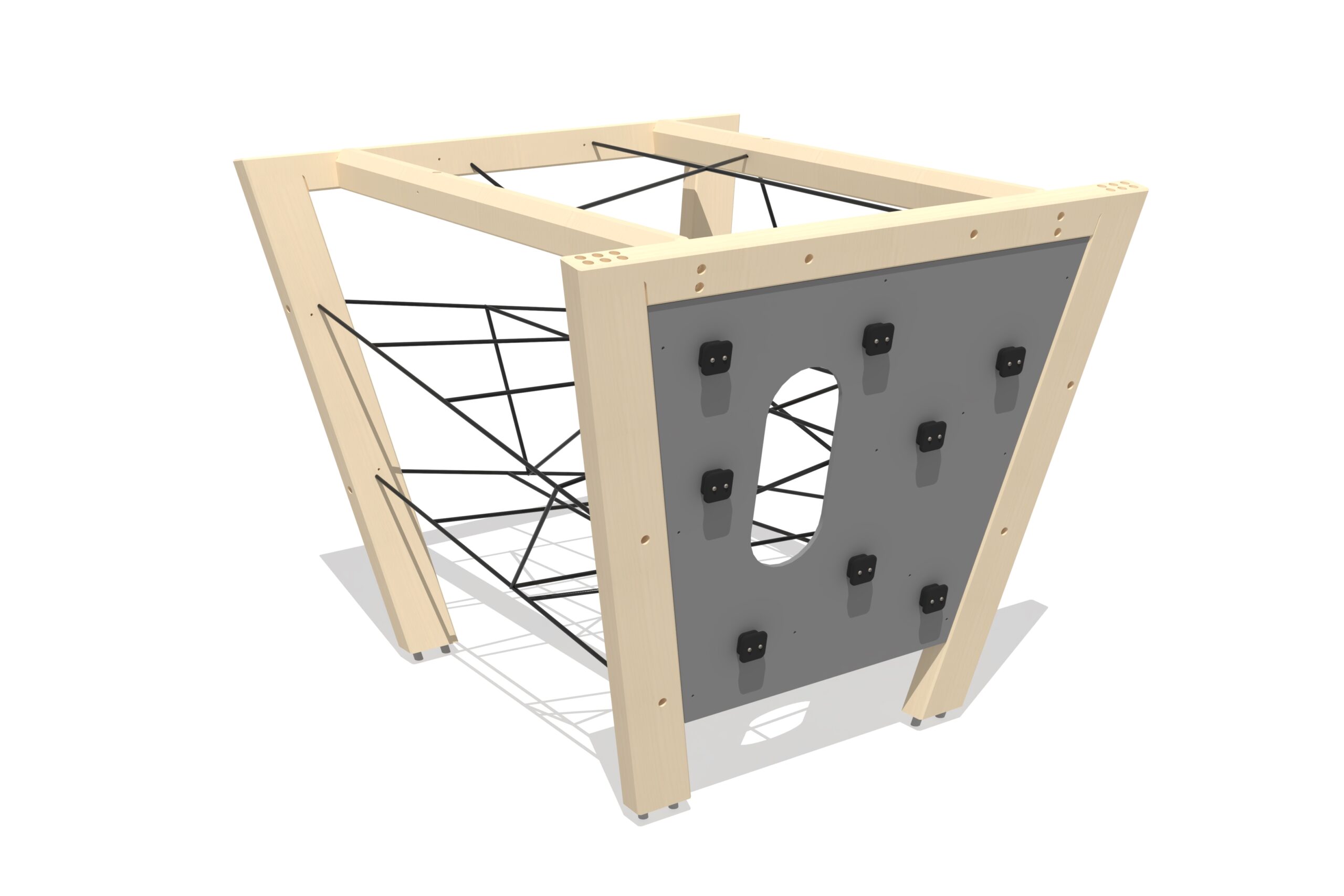 Klätterställning i AMAZON-serien för offentlig utemiljö som stödjer klättring, balans och koordination i naturlig färgsättning.