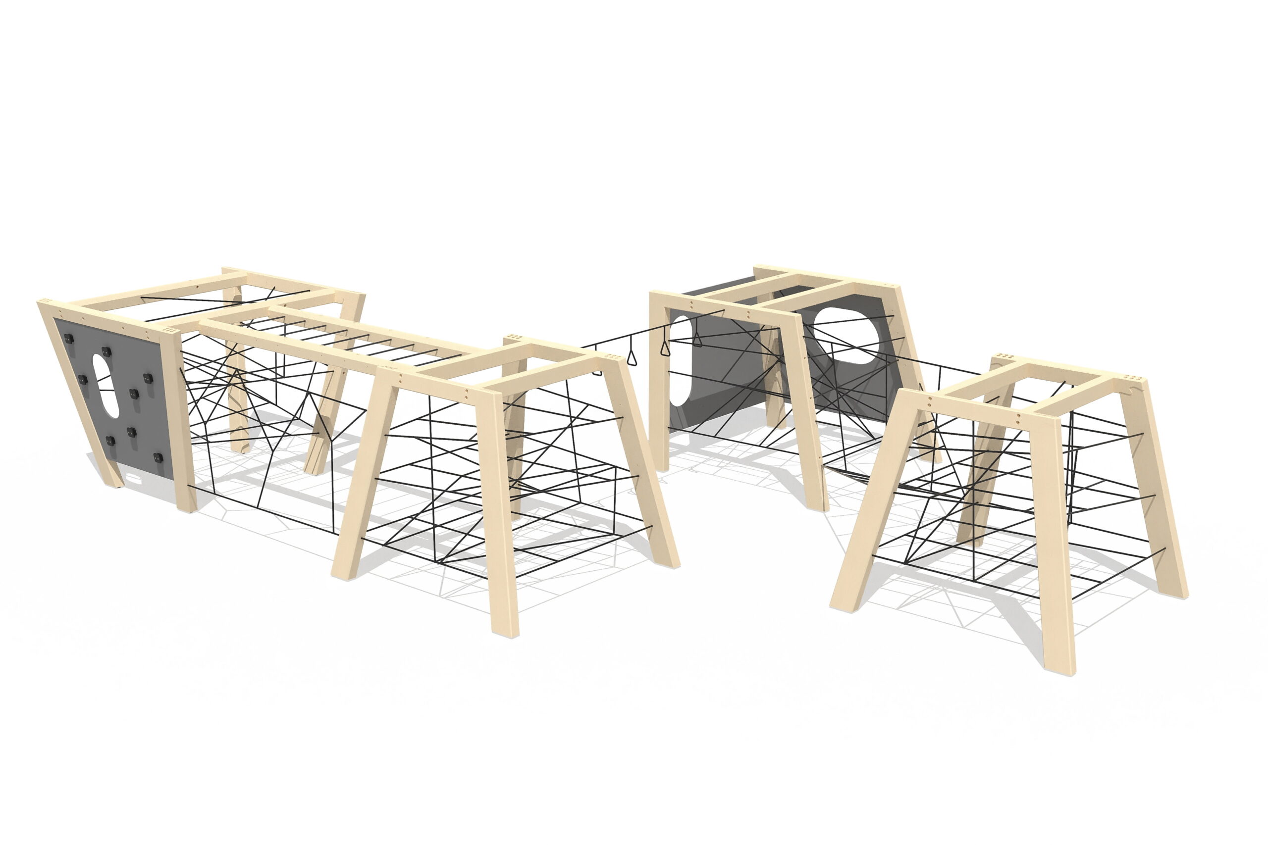 Klätterställning i AMAZON-serien för offentlig utemiljö som stödjer klättring, balans och koordination i naturlig färgsättning.