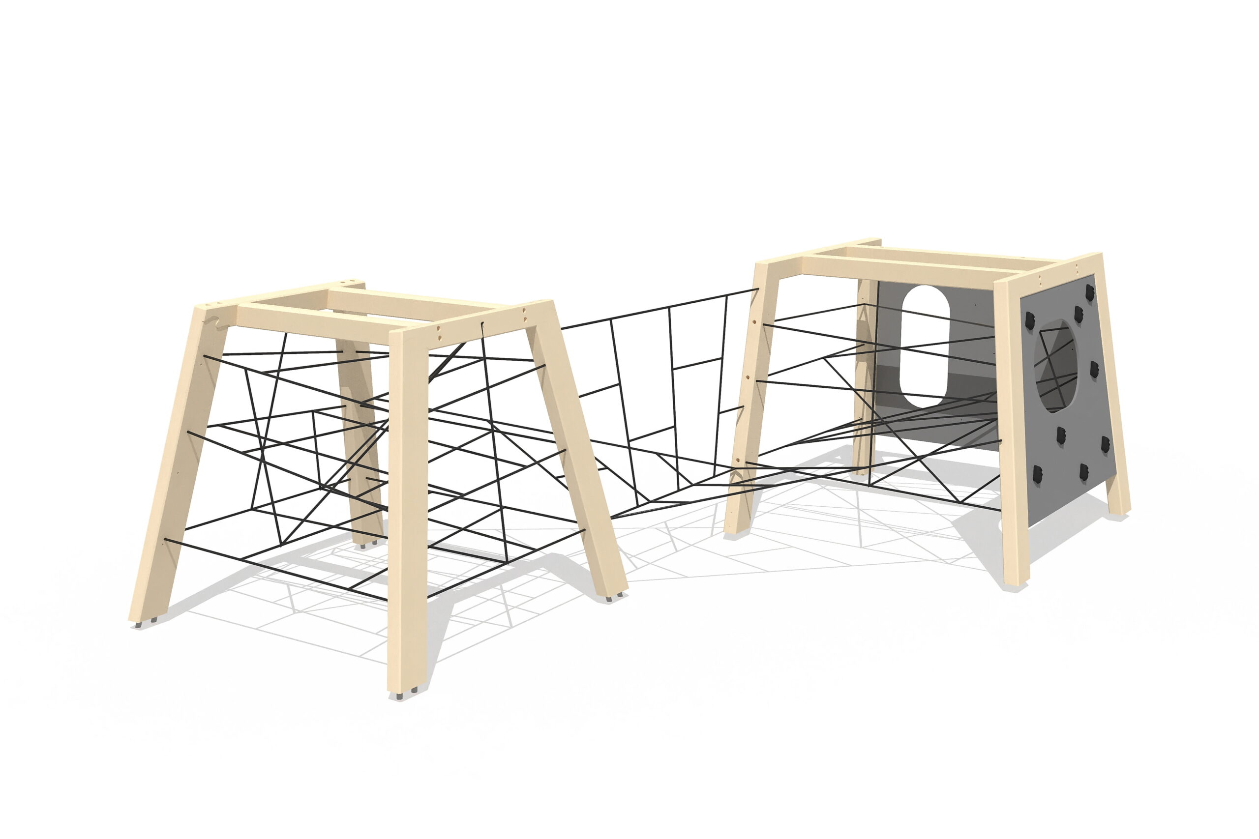 Klätterställning i AMAZON-serien för offentlig utemiljö som stödjer klättring, balans och koordination i naturlig färgsättning.