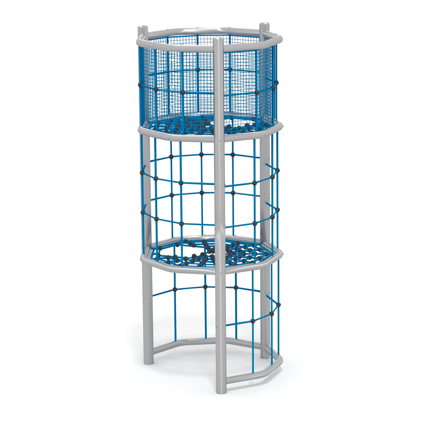 Klättertorn Alonn i rostfritt stål och polyesterrep för offentlig miljö.