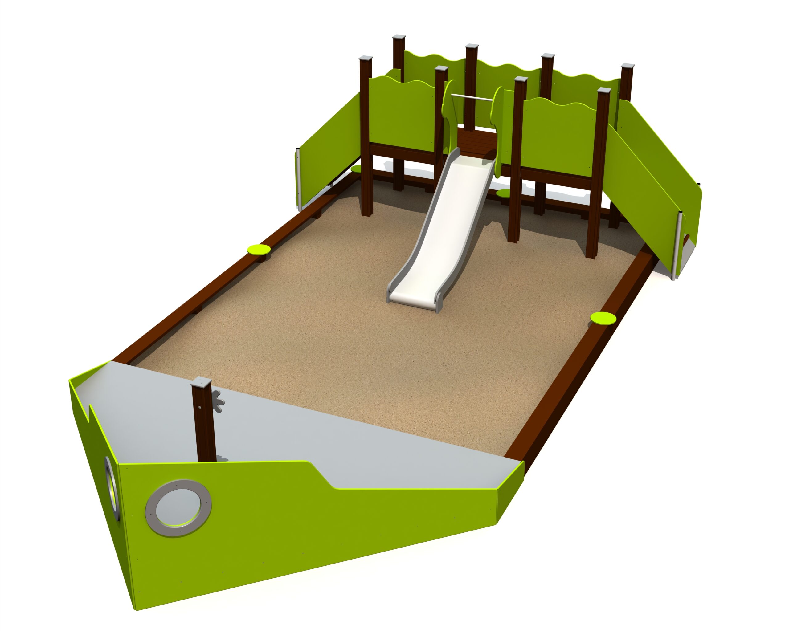 Detta lekskepp kombinerar en stor sandlåda med en rutschkana och lång plattform. Plattformen nås via dubbla trappor med ledstänger och leder till en rutschkana med höjden 0,95 meter. Skeppet är utrustat med ratt för rollekslek och kan kompletteras med aktivitetspaneler. Levereras utan sand.