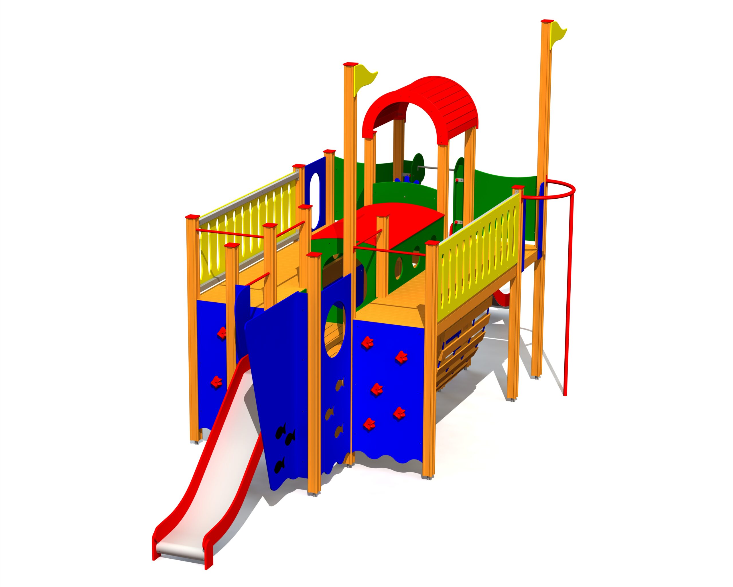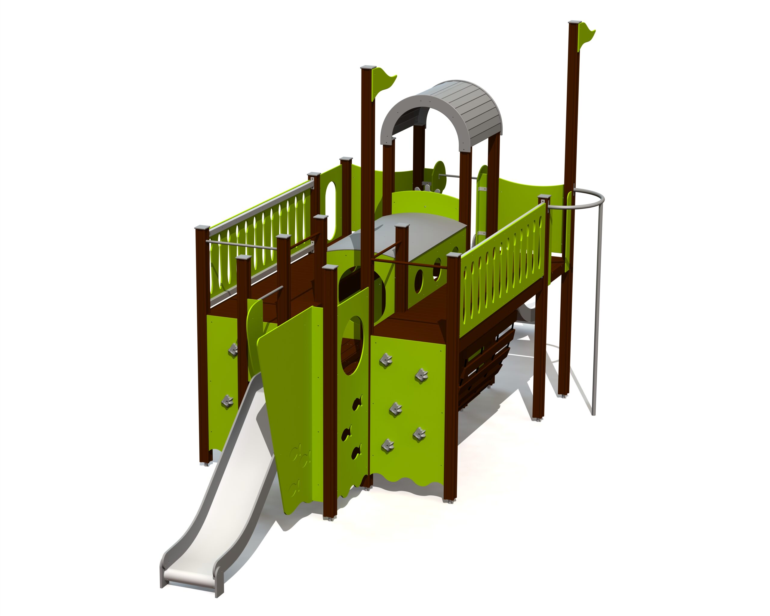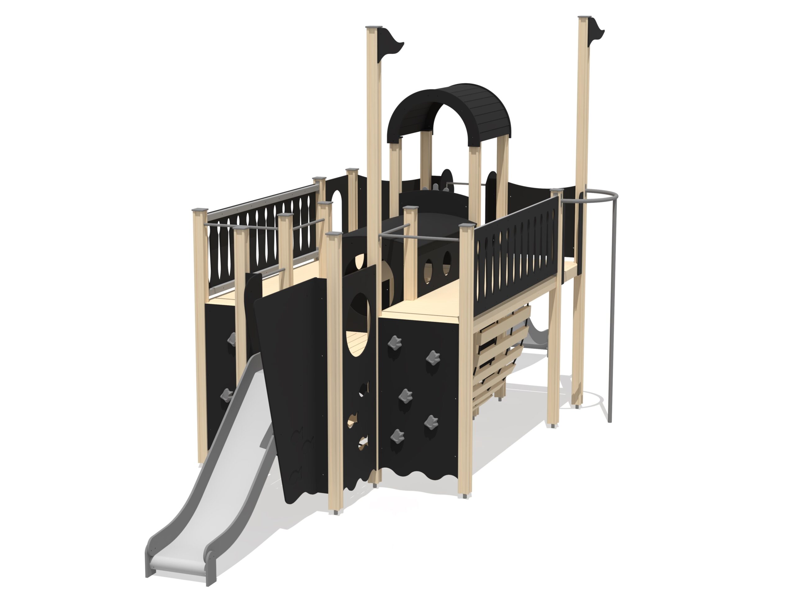 Stort lekskepp som kombinerar klättring, höjdlek och fartfylld glidlek. Skapar utrymme för intensiv och fantasifull sjölek.
